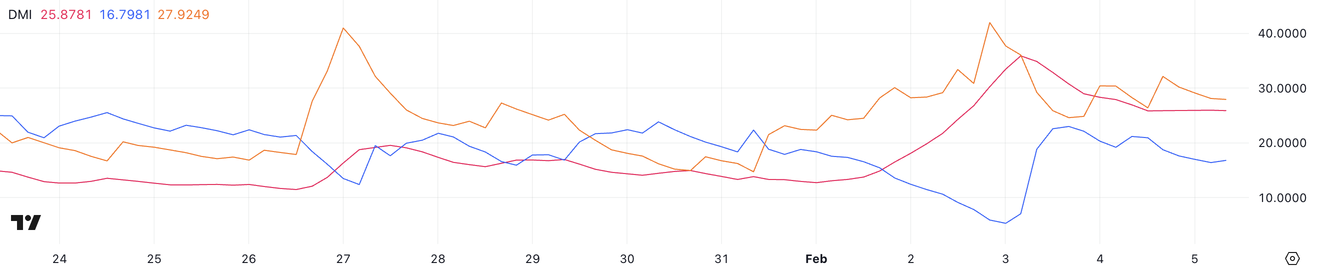 Wykres wskaźnika DMI dla BTC pokazuje, że jego ADX spadł do 25,8, z 35,8 zaledwie trzy dni temu. Ten spadek wskazuje, że siła dominującego trendu słabnie, sugerując, że ostatni ruch cenowy kryptowaluty traci impet. Bitcoin próbuje odzyskać siły po trendzie spadkowym, ale spadający ADX raczej wskazuje, że to ożywienie nie ma silnego potwierdzenia trendu.