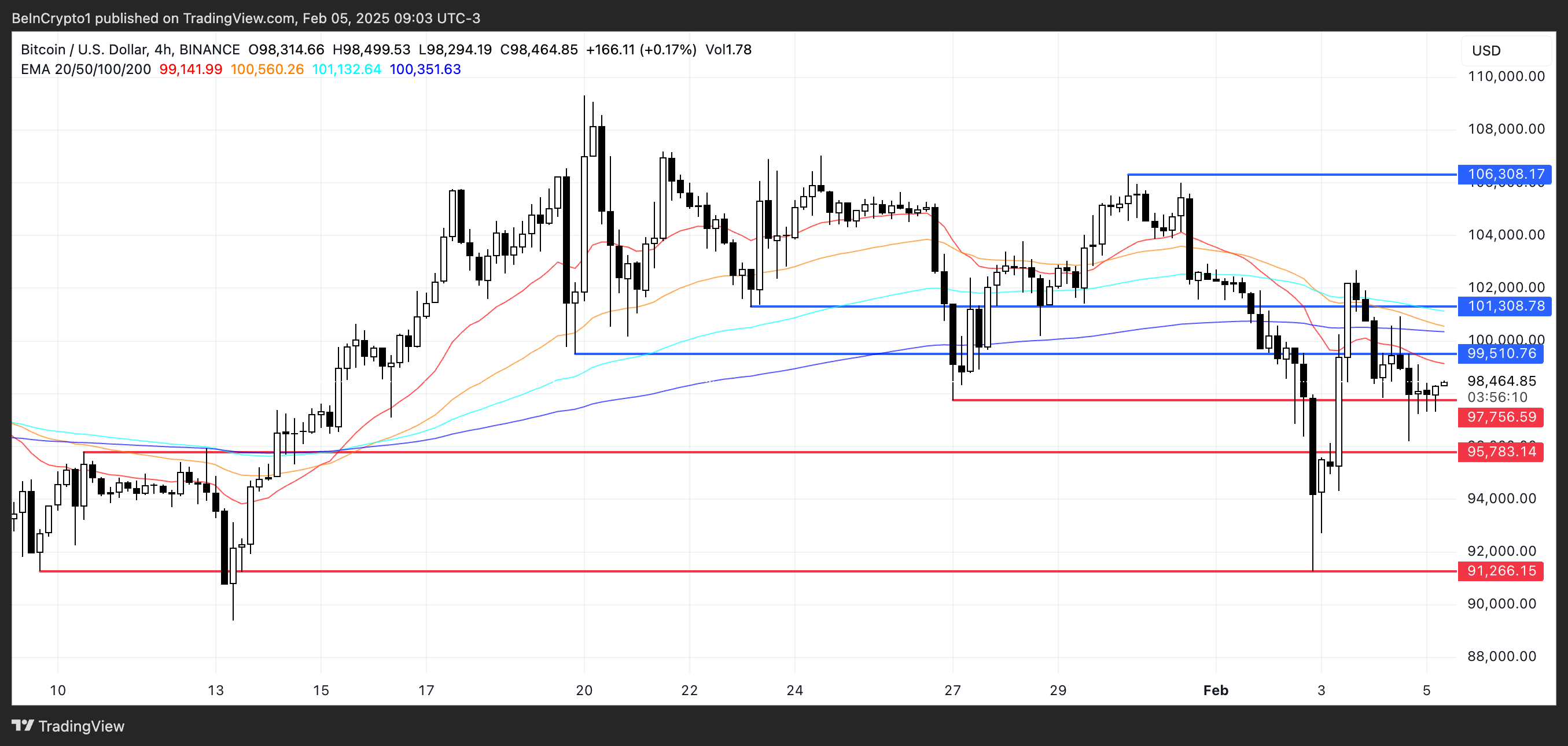 Cena Bitcoina utknęła i obecnie handluje w wąskim zakresie, napotykając opór wokół 99 500 USD. Jednocześnie utrzymuje wsparcie na poziomie 97 700 USD. Natomiast, ustawienie pozostaje niedźwiedzie w oparciu o strukturę EMA, gdzie krótkoterminowe średnie kroczące są poniżej długoterminowych. Wskazuje to na trwającą presję spadkową, pomimo niedawnego oświadczenia Crypto Czara prezydenta Trumpa, Davida Sacksa, że Bitcoin jest „doskonałym magazynem wartości.”