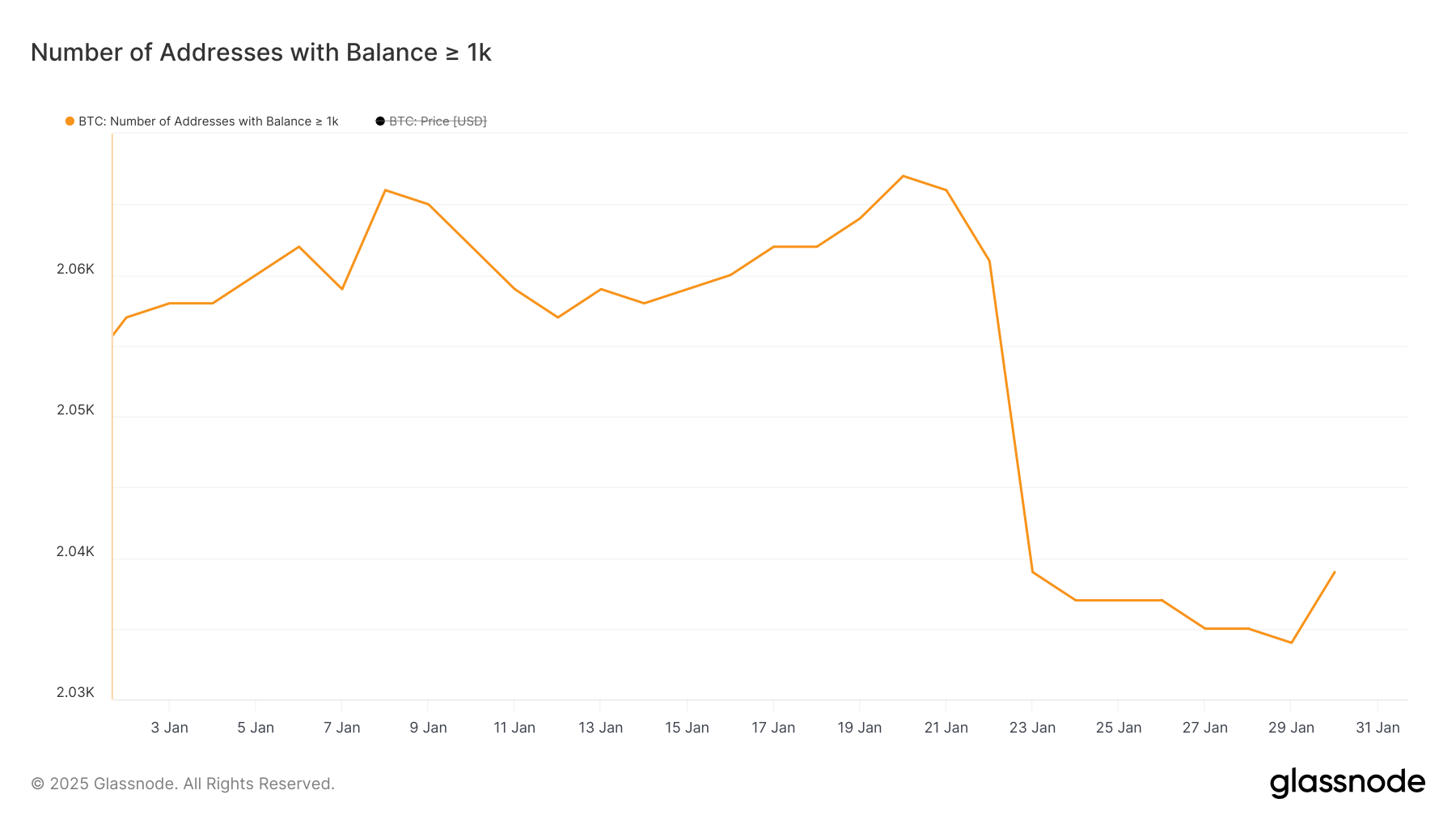 Liczba wielorybów posiadających co najmniej 1000 BTC znacznie spadła między 22 a 29 stycznia, z 2061 do 2034, co jest najniższym poziomem od lutego 2024. Ten stały spadek sugerował, że duzi posiadacze zmniejszali swoje zaangażowanie, co potencjalnie sygnalizowało zmniejszone zaufanie lub realizację zysków na rynku.