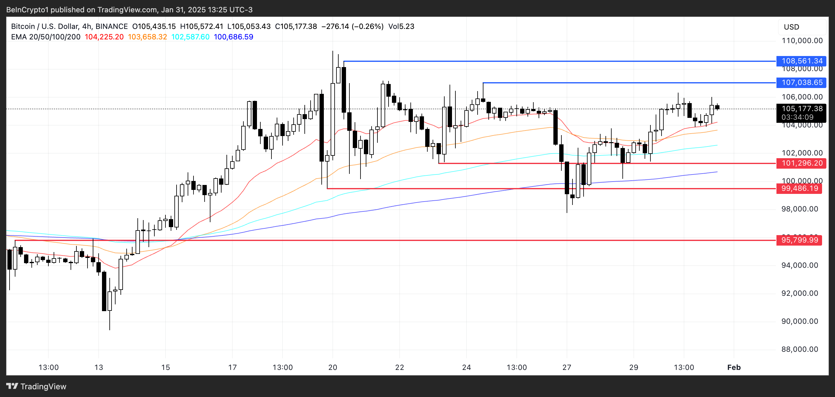 Po stronie spadkowej, jeśli cena BTC nie utrzyma impetu i trend się odwróci, może spaść do 101 296 USD, kluczowego poziomu wsparcia. Utrata tego poziomu może przyspieszyć presję sprzedażową, zepchnąć BTC do 99 486 USD.