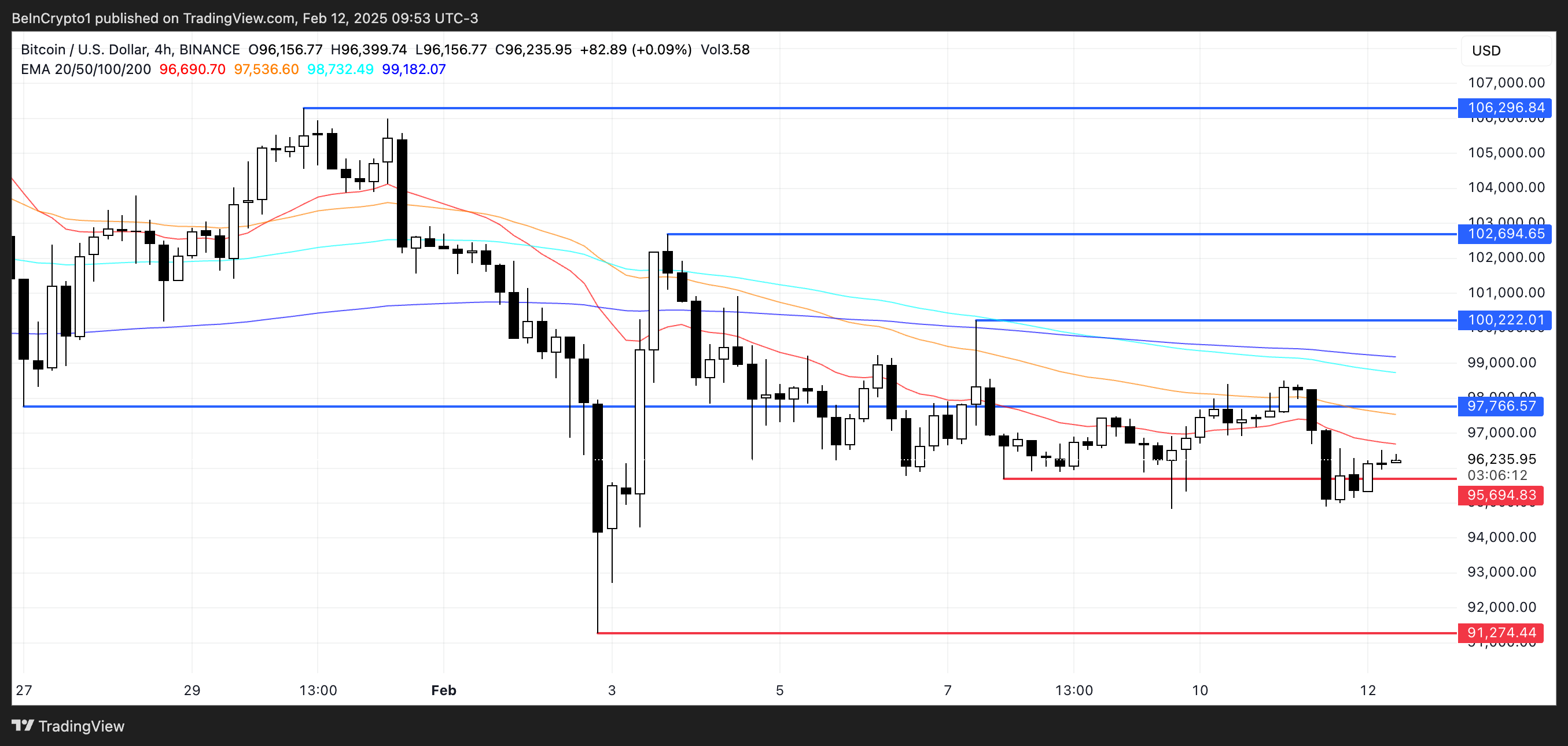 Linie EMA dla Bitcoina pozostają niedźwiedzie, z krótkoterminowymi EMA wciąż poniżej długoterminowych. Obecnie największa kryptowaluta handluje blisko kluczowego poziomu wsparcia 96 700 USD, co jest kluczowe dla utrzymania stabilności.