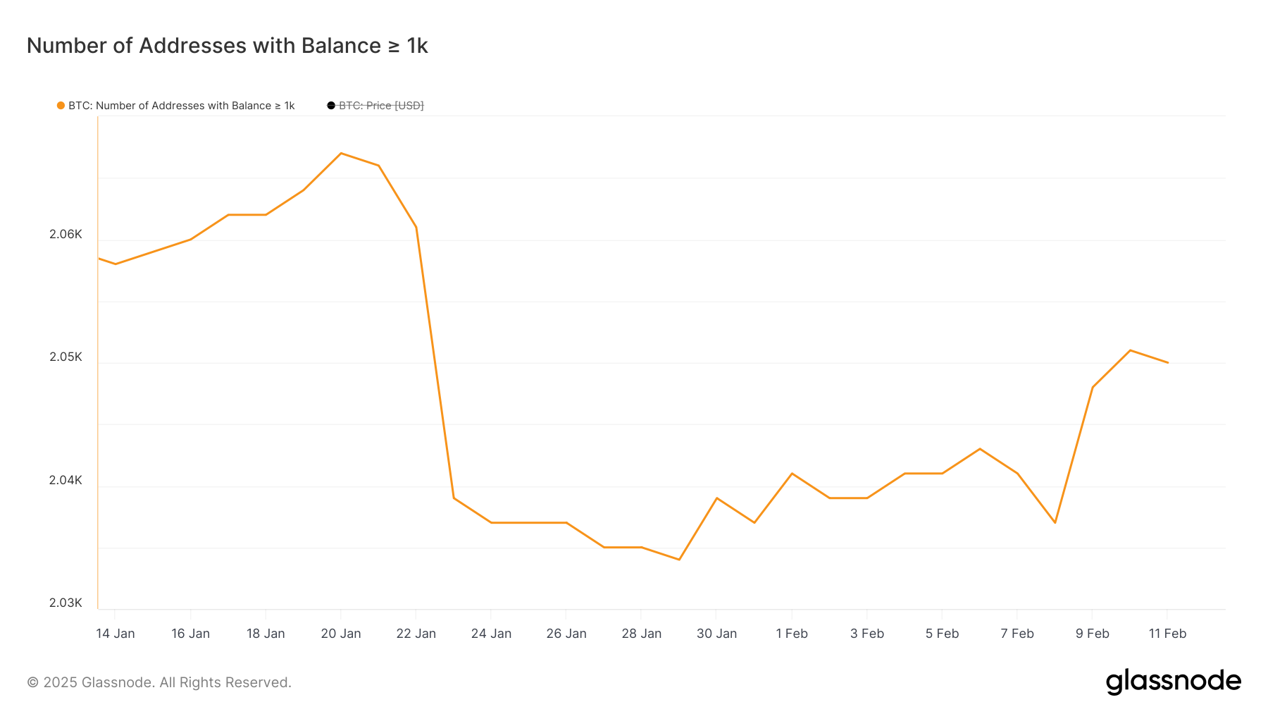 Liczba adresów wielorybów BTC, które posiadają co najmniej 1000 BTC, osiągnęła roczny dołek na poziomie 2034 w dniu 29 stycznia, po gwałtownym spadku w styczniu. Chociaż próbowała odbicia, osiągając 2043 w dniu 6 lutego, liczba ta ponownie spadła, zanim zaczęła powoli rosnąć do 2050.