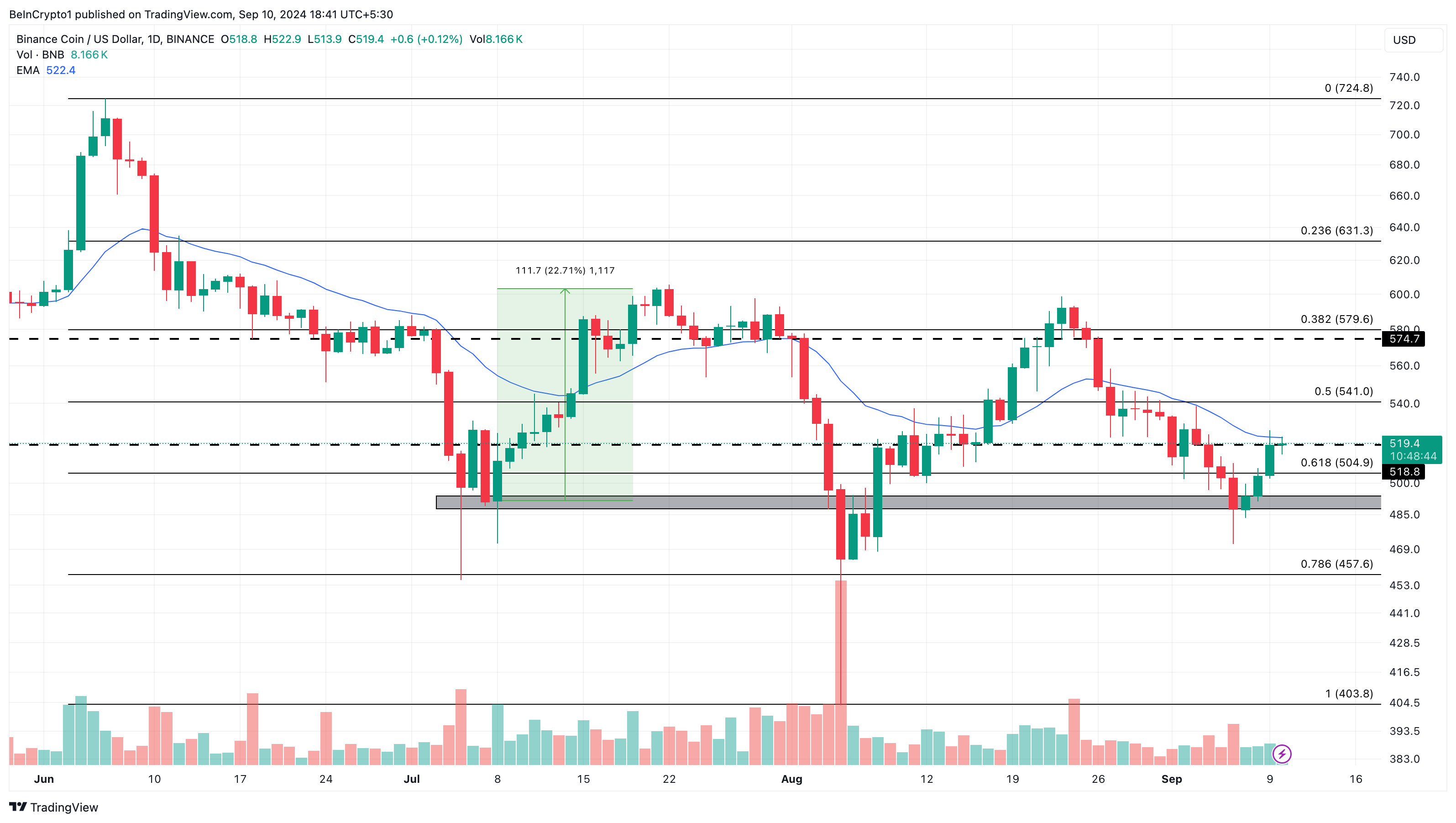 Na podstawie dziennego wykresu, BNB otrząsnęło się z wcześniejszego spadku i odbiło się od 487 USD. Ten spory wzrost sugeruje, że byki agresywnie broniły wsparcia, które było kluczowe dla wzrostu monety do 603 USD w lipcu.