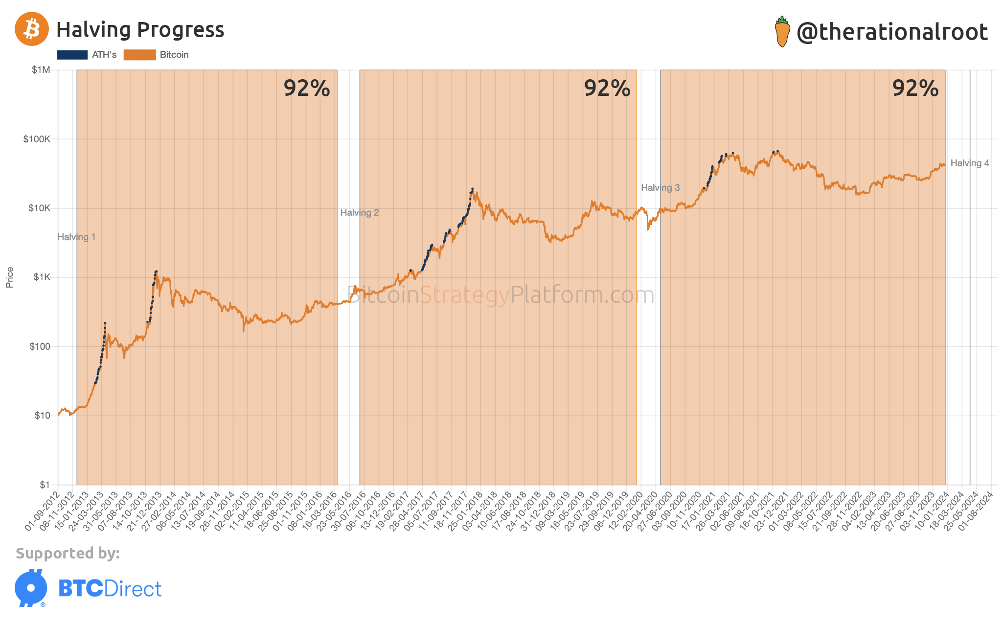 Halvingu dotyczy też ostatni z wykresów opublikowanych przez analityka, według którego halving BTC jest już gotowy w 92%. Według najnowszych danych wydarzenie to jest oczekiwane w dniu 17 kwietnia 2024 roku. Jeżeli spojrzeć na 2 poprzednie cykle, to widzimy, że ostatnie 8% (czyli około 100 dni) w przeszłości przynosiło drastycznie różne akcje ceny BTC.