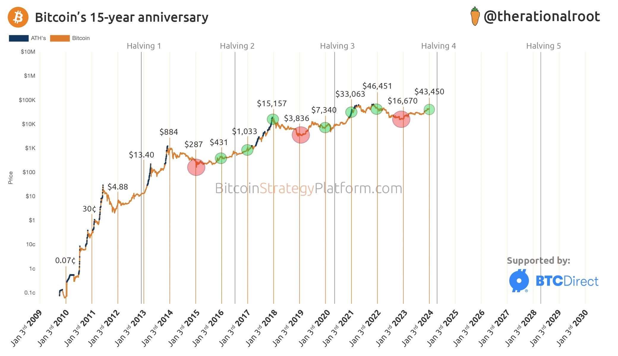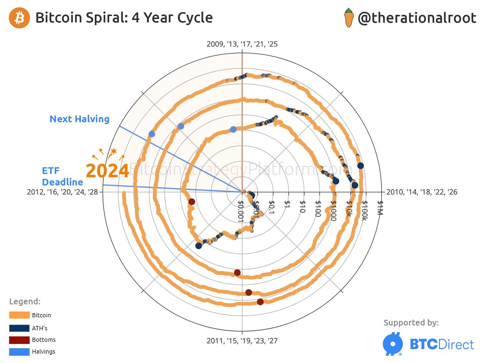 Oprócz wykresu ceny BTC na 15-tą rocznicę istnienia sieci Bitcoin @therationalroot zaktualizował też swoje dwa inne sztandarowe wykresy. Pierwszy dotyczy spiralnej reprezentacji akcji cenowej Bitcoina w interpretacji 4-letnich cykli. Okazuje się, że wraz z początkiem 2024 roku Bitcoin historycznie powinien wkraczać w długoterminowy, około 2-letni rynek byka.