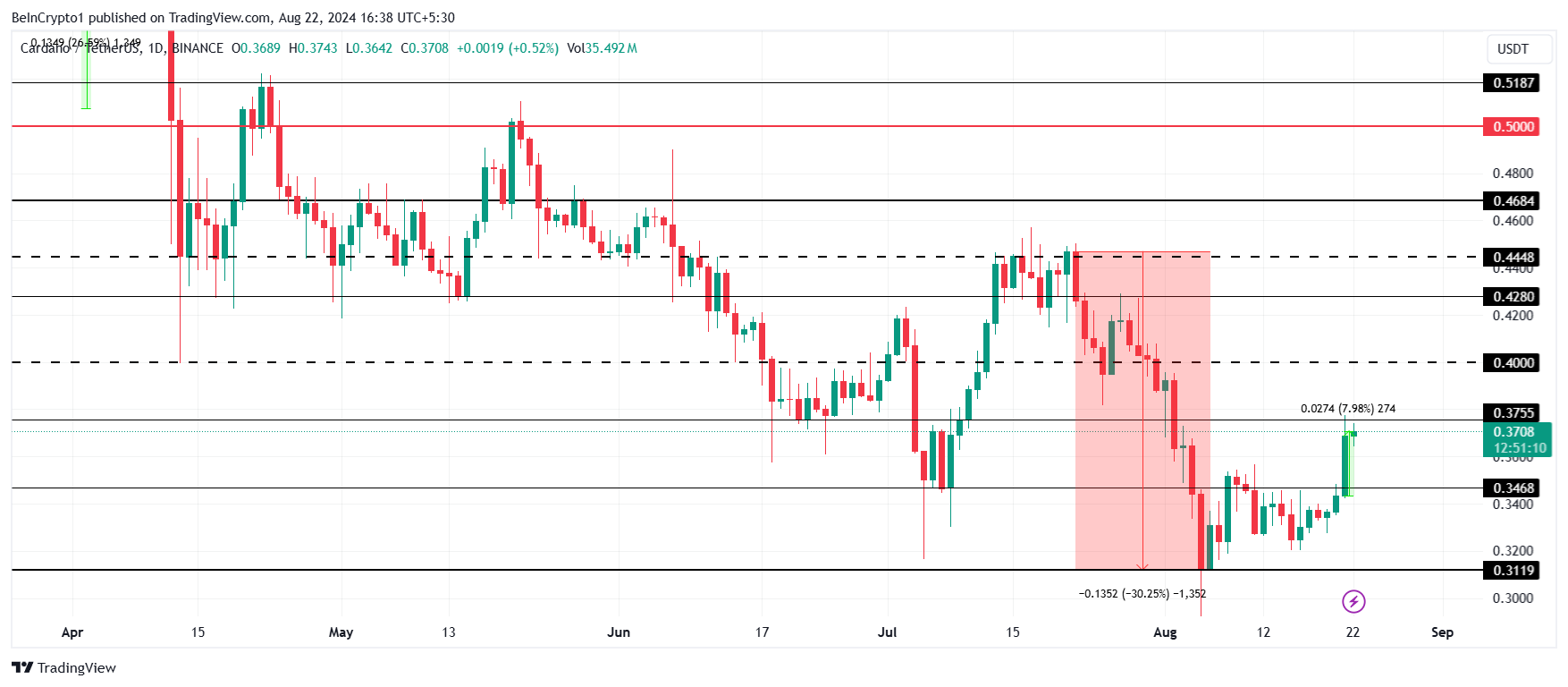 Cena Cardano stoi poniżej oporu na poziomie 0,37 USD i próbuje przekształcić go we wsparcie. Odbicie od tego poziomu w przeszłości przynosiło zyski inwestorom, co również teraz może się powtórzyć.