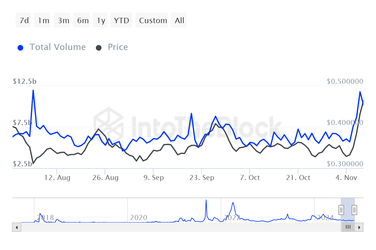 Ostatnie ruchy cenowe Cardano spowodowały znaczny wzrost wolumenu transakcji wielorybów, z łączną kwotą 11,5 mld USD obrotu przez dużych posiadaczy tylko w ciągu ostatnich pięciu dni. Ostatni raz taki poziom aktywności wielorybów Cardano odnotowało ponad sześć miesięcy temu, w maju. Odnowione zaangażowanie dużych posiadaczy portfeli, będących jedną z najbardziej wpływowych grup inwestorów, sugeruje rosnącą pewność co do trajektorii cenowej ADA.