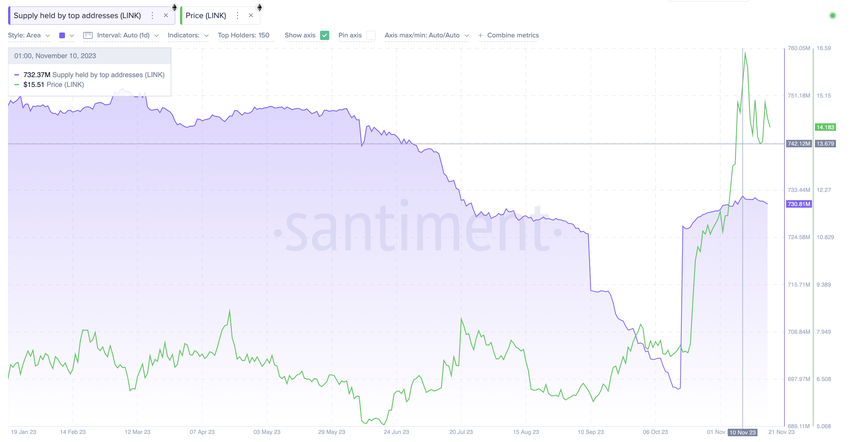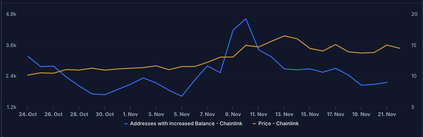 Według Santiment, w tym okresie szybko zgromadzili oni 36,07 miliona LINK, dzięki czemu ich łączne salda osiągnęły 4-miesięczny szczyt w wysokości 730,37 miliona tokenów. Jednak odkąd 11 listopada cena osiągnęła szczyt na poziomie 16,60 USD, znacznie spowolniło to presję zakupową.