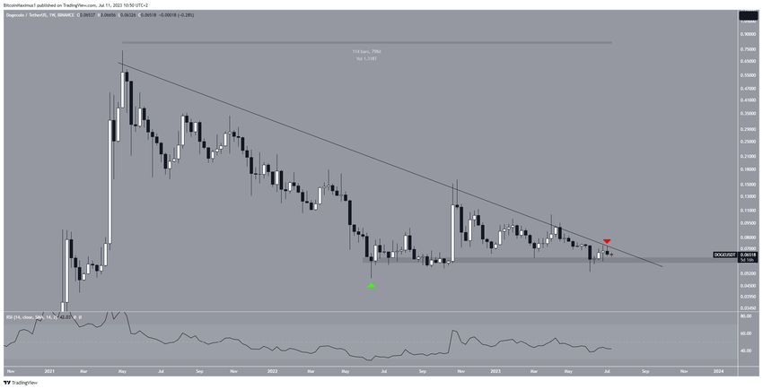 Zgodnie z analizą techniczną tygodniowego interwału zaobserwowano, że cena Dogecoin spadła poniżej opadającej linii oporu po osiągnięciu rekordu wszech czasów (ATH) na poziomie 0,739 USD w maju 2021 roku. Spadek ten doprowadził do makro dołka na poziomie 0,049 USD w czerwcu 2022 roku.