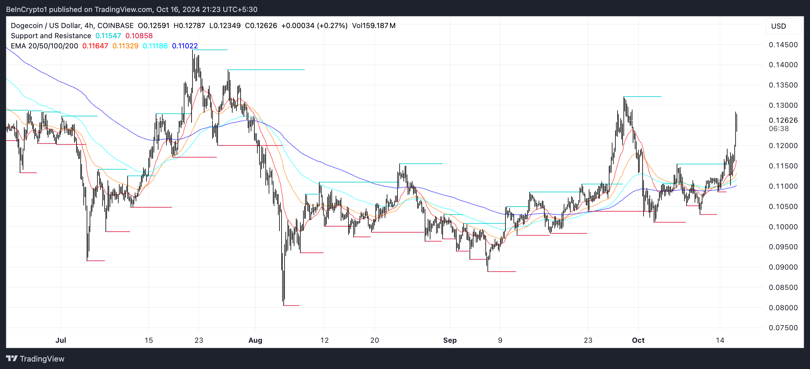 Linie EMA (Exponential Moving Average) dla Dogecoin (DOGE) są obecnie w formacji byczej, z krótkoterminowymi EMA umieszczonymi powyżej długoterminowych EMA. To ustawienie jest znakiem pozytywnego trendu, co wskazuje, że ostatnie ruchy cenowe były dodatnie i że trend wzrostowy może się utrzymać.