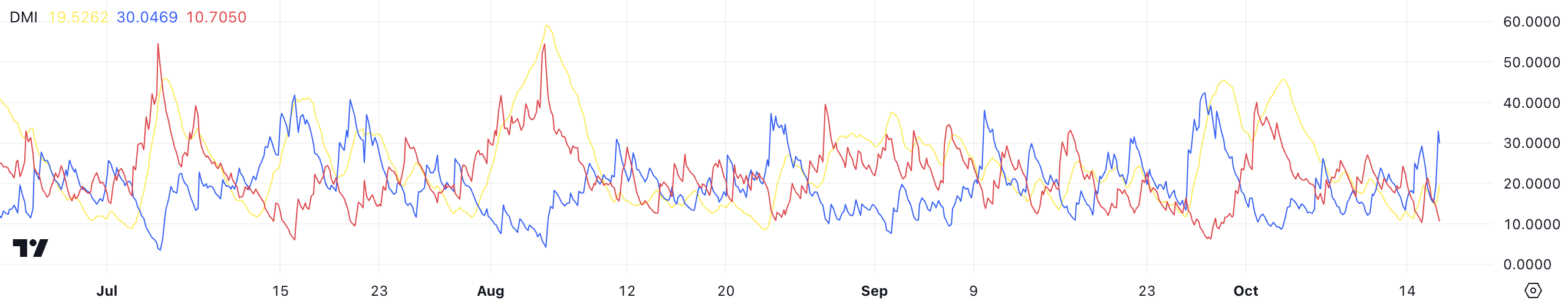 SponsoredWykres DMI zawiera linię ADX (żółta), linię D+ (niebieska) i linię D- (czerwona). Linia D+, która wynosi 30,04 wskazuje na pozytywną presję kupna, podczas gdy linia D-, na poziomie 10,70 reprezentuje presję sprzedaży. Znaczna różnica między D+ a D- wskazuje, że presja kupna jest wyraźnie dominująca, wspierając ostatni wzrost ceny altcoina.