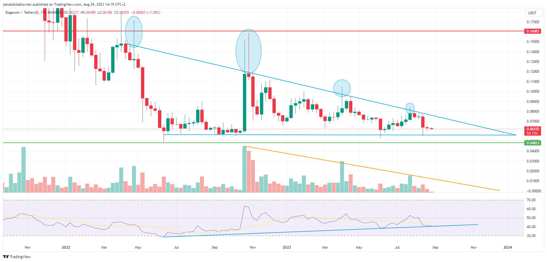 Co więcej, Dogecoin porusza się w formacji zstępującego trójkąta (niebieskie linie), poza którym kurs nie zamknął się od kwietnia 2022 roku, czyli od 16 miesięcy. Pomimo kilku odchyleń powyżej (niebieskie obszary) formacja utrzymuje się. Co więcej, wolumen, który regularnie spada od października 2022 roku (pomarańczowa linia), potwierdza jej zasadność.