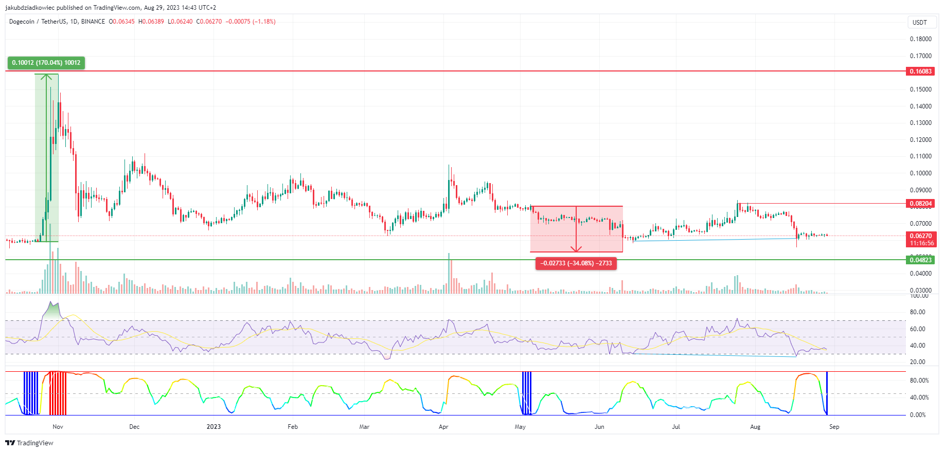 Ostatnie dwa razy, gdy BBWP osiągnął poziom ekstremalnie niskiej zmienności, w kolejnych dniach miał miejsce duży ruch ceny DOGE. Pierwszy raz stało się to w październiku 2022 roku. Cena Dogecoin wzrosła o 170% i osiągnęła szczyt długoterminowego zakresu tuż poniżej 0,160 USD. Natomiast drugi raz minimalna zmienność pojawiła się w maju 2023 roku. Po tym wydarzeniu cena DOGE spadła o 34% do dołka na 0,053 USD.