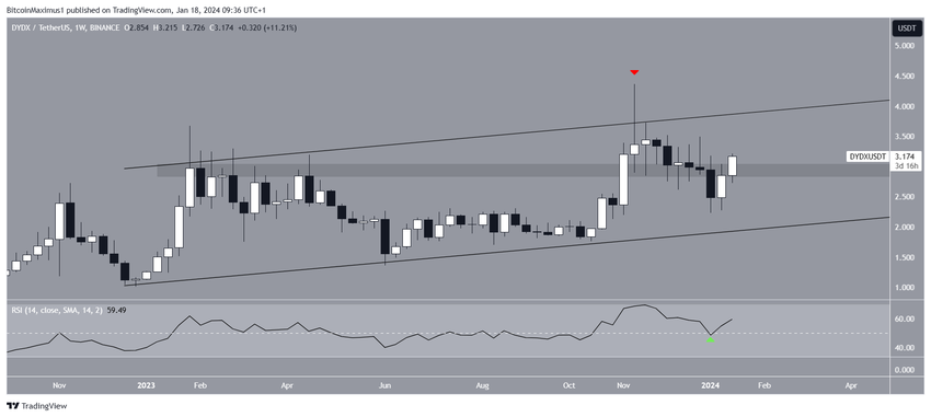 Cena DYDX wzrosła wewnątrz rosnącego kanału równoległego od początku 2023 roku. Linie trendu wsparcia i oporu kanału zostały wystarczająco często potwierdzone, ostatnio w listopadzie (czerwona ikona).