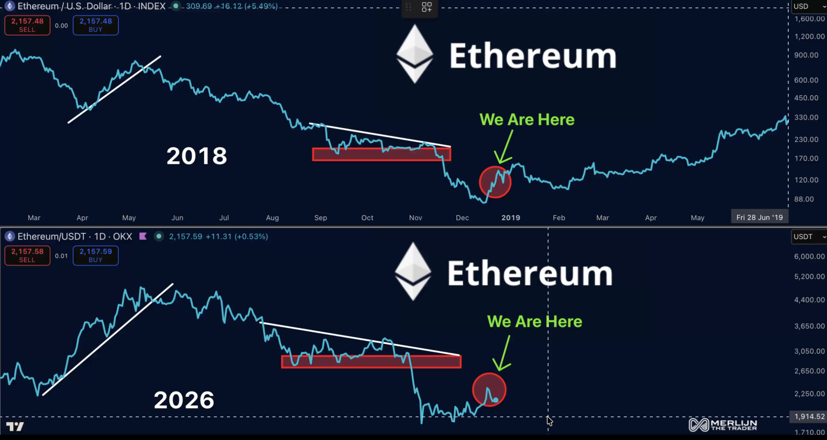 „Trend spadkowy. Konsolidacja. Wybicie w dół. Kapitulacja. Potem odbicie. 2018: ‘Jesteśmy tutaj’. Następnie ETH wzrosło 20x. 2026: ten sam moment. Ta sama struktura. Właśnie teraz. Powyżej 2500 USD: fraktal potwierdza. Rozpoczyna się odbicie. Poniżej 1900 USD: jeszcze jeden dołek przed zwrotem. Ten sam wykres. Osiem lat później. Ten sam wynik nadchodzi.”