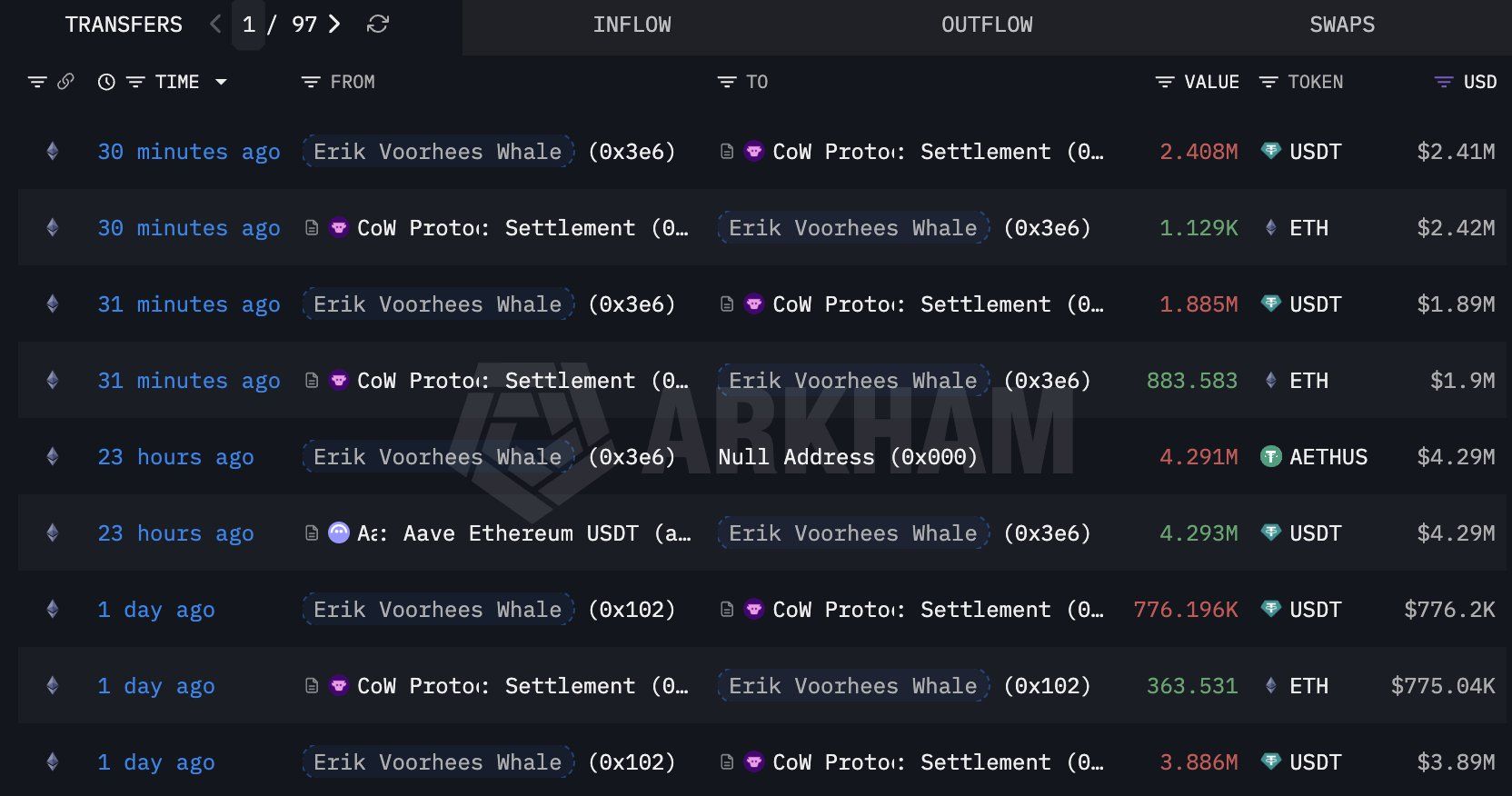 Równocześnie platforma Lookonchain podała dane o dużych zakupach. Jeden z wielorybów, powiązany z Erikiem Voorheesem, kupił ETH za 260 mln USD. Średnia cena altcoina wyniosła około 2162 USD.