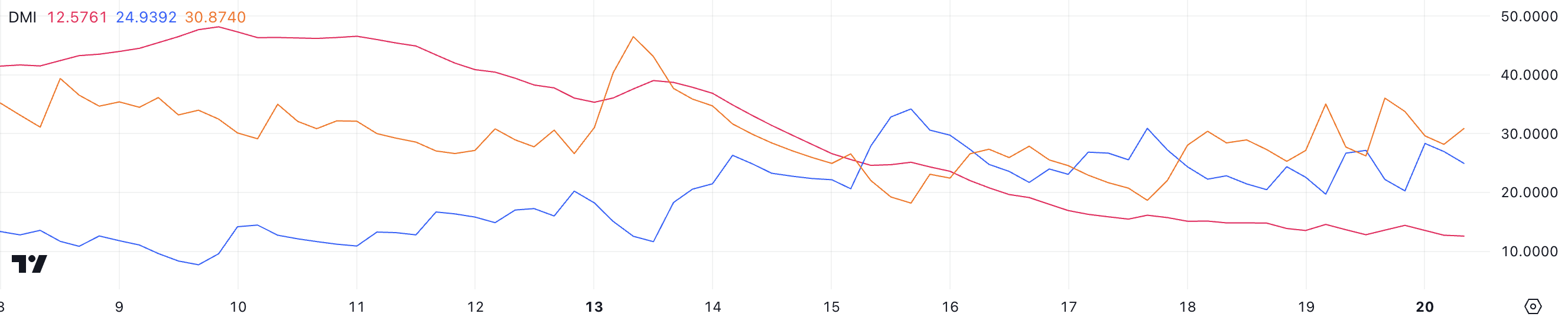 Wykres DMI (wskaźnik kierunkowego ruchu) dla Ethereum pokazuje, że ADX wynosi obecnie 12,5 i pozostaje poniżej 20 przez ostatnie cztery dni. ADX (średni wskaźnik kierunkowy) mierzy siłę trendu, a odczyty poniżej 20 wskazują na słaby lub nieokreślony trend.