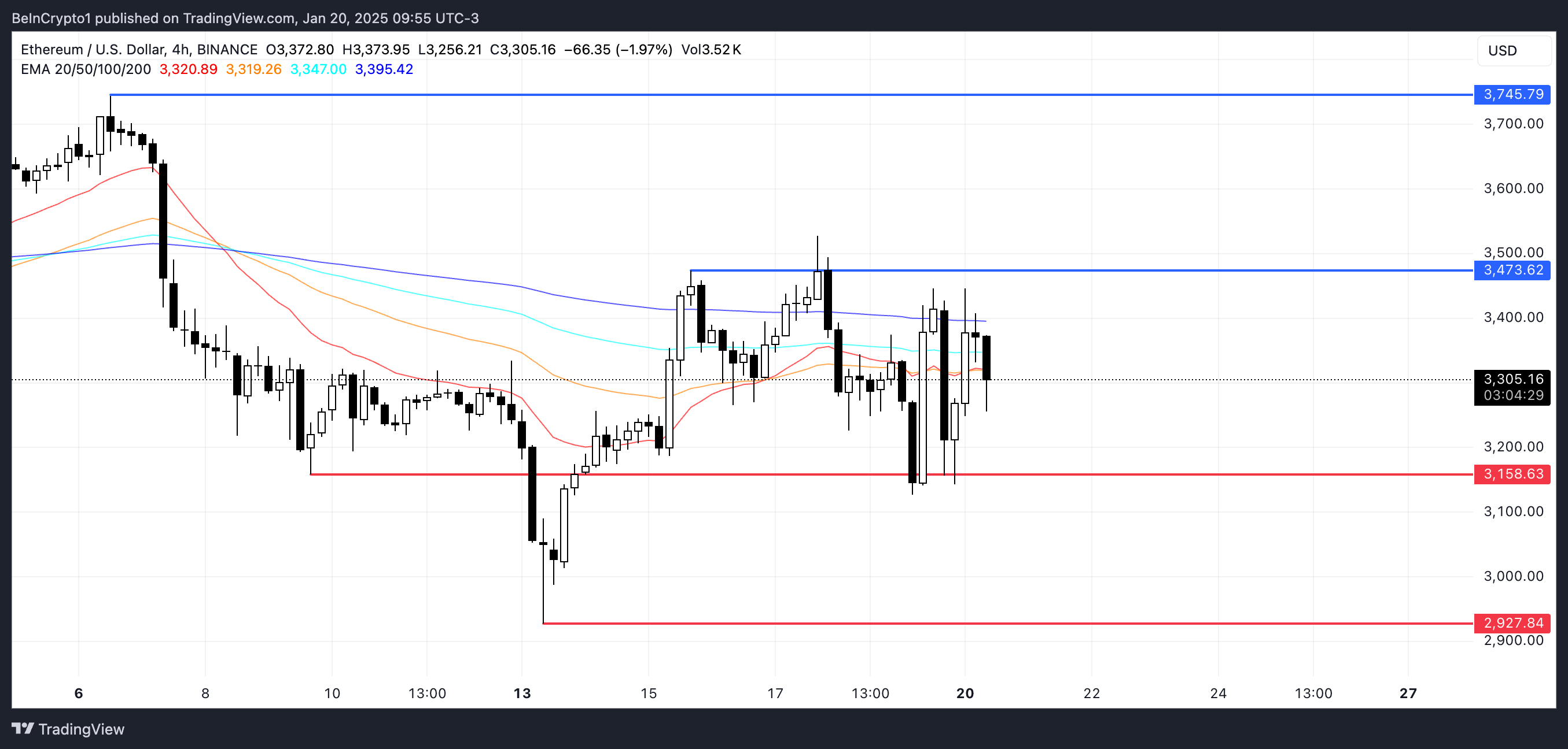 Linie EMA dla ETH wskazują, że jego obecny trend pozostaje nieokreślony, co odzwierciedla brak wyraźnego kierunku na rynku. Chociaż ETH wzrosło między 13 a 16 stycznia, jego wydajność w ciągu ostatnich siedmiu dni była gorsza niż głównych monet.