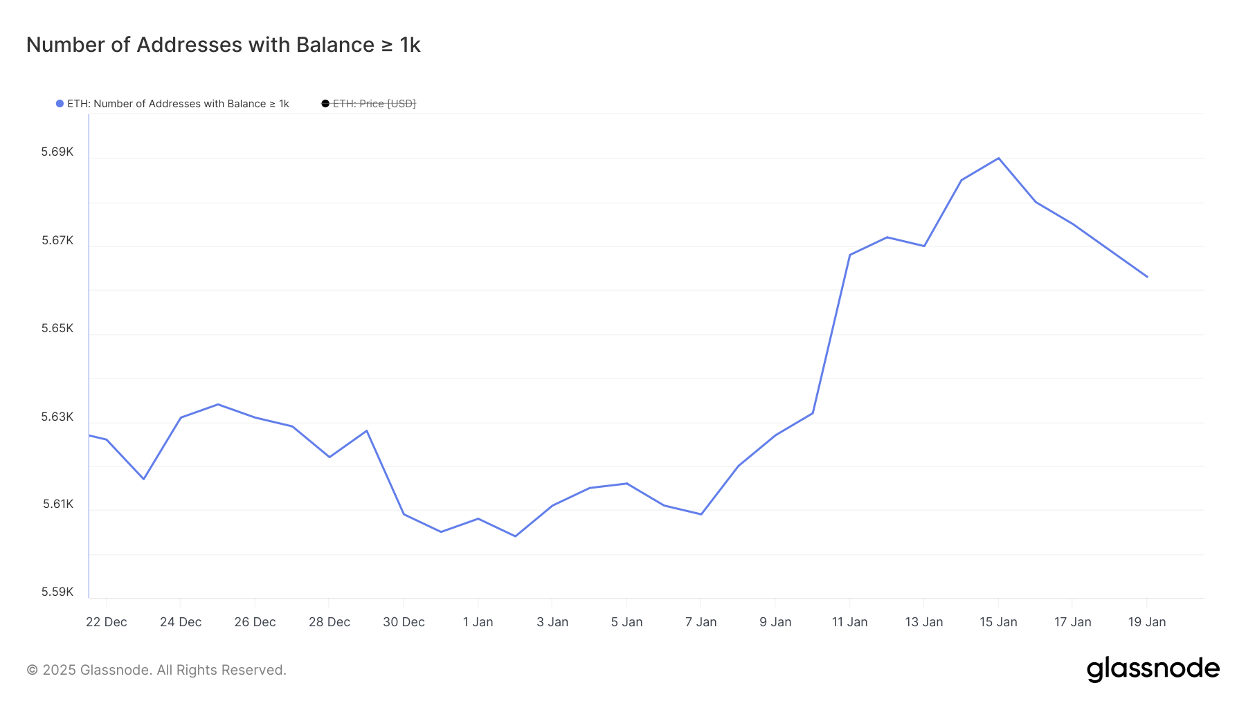 Liczba wielorybów ETH — adresów posiadających co najmniej 1000 ETH — osiągnęła 11-miesięczny szczyt na poziomie 5690 w dniu 15 stycznia. Jednak od tego czasu spadła do 5663.