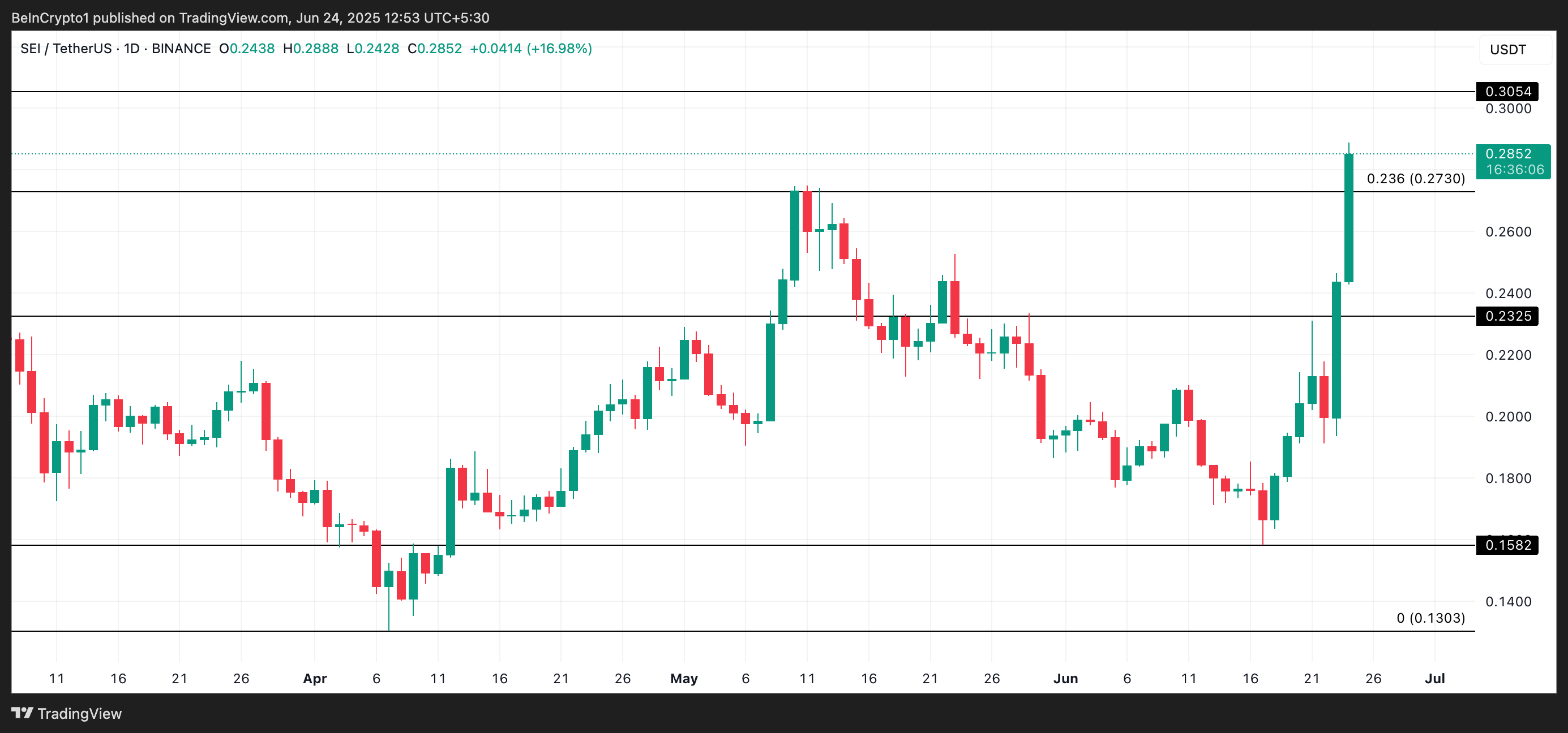 Na ten moment altcoin handluje na czteromiesięcznym szczycie wynoszącym 0,28 USD w momencie publikacji. Równocześnie, w obliczu słabej wydajności szerszego rynku w ciągu ostatniego tygodnia, cena SEI wzrosła o ponad 65%.