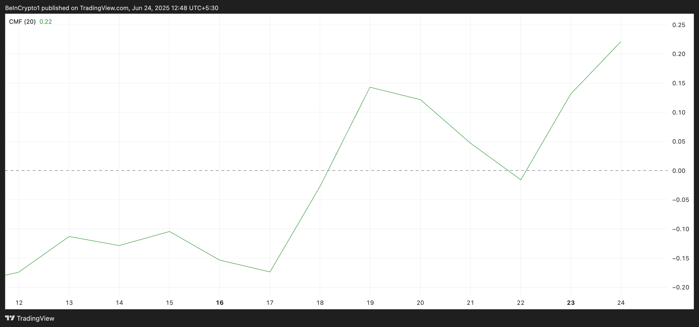 Wraz z napływem kapitału do sieci, moneta SEI odnotowała wzrost popytu, co odzwierciedla rosnący wskaźnik przepływu pieniędzy Chaikina (CMF). W momencie pisania tego tekstu, ten wskaźnik momentum wynosi 0,22 – wskazując na potencjalne wybicie altcoina i utrzymującą się presję zakupową.