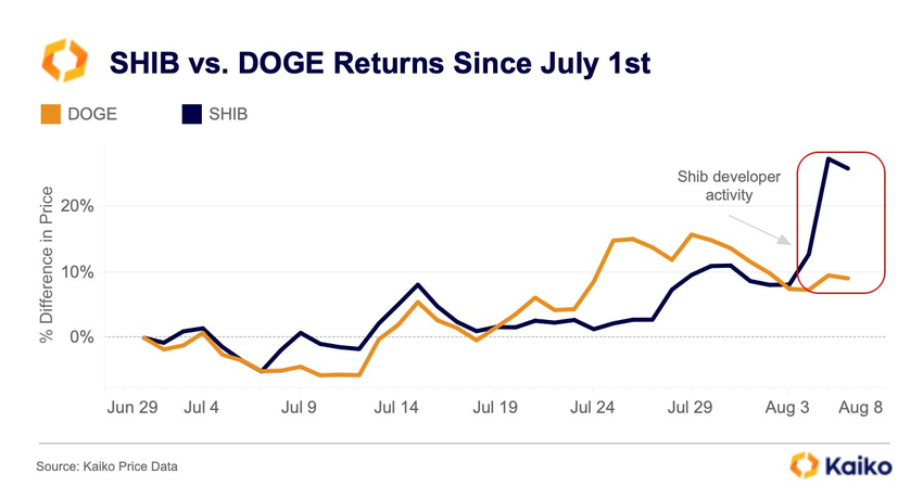 Firma analityczna Blockchain Kaiko zauważyła, że Shiba Inu wzrosła o ponad 25% od 1 lipca po fali aktywności deweloperów w sieci.