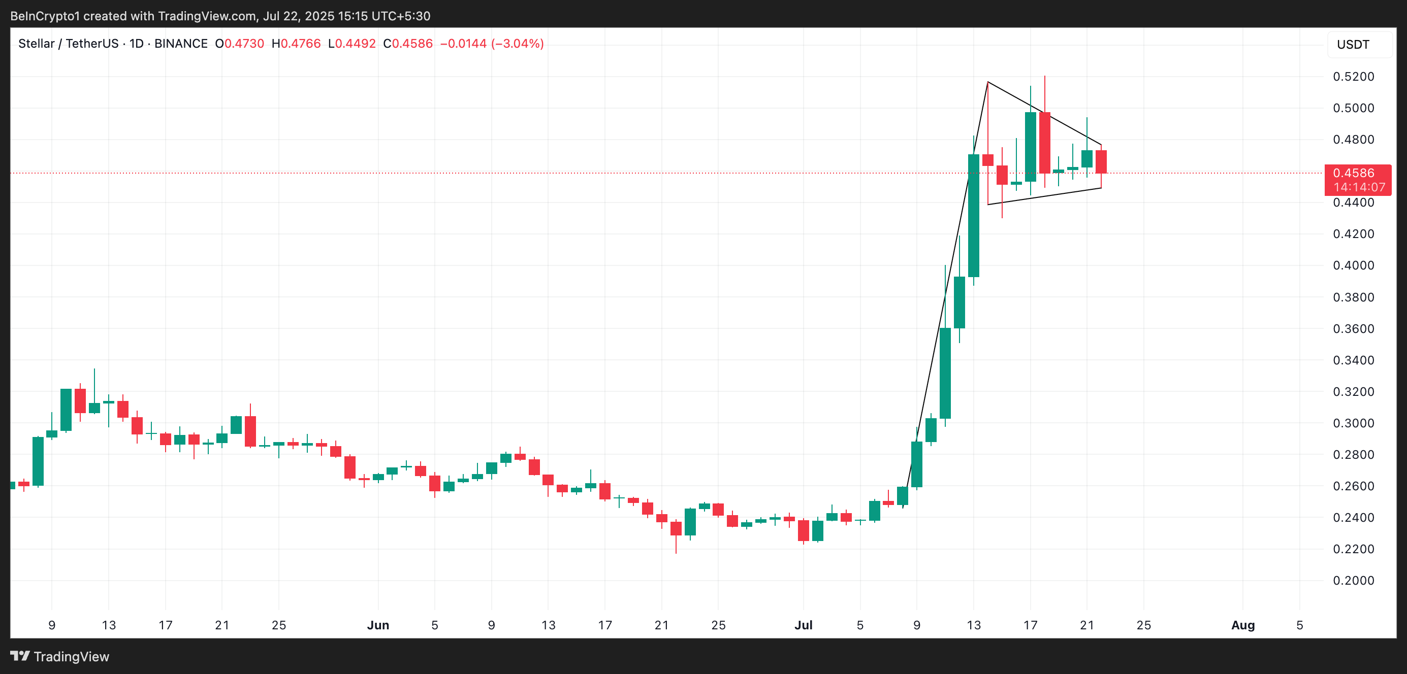 Na wykresie jednodniowym Stellar (XLM) utworzył byczy proporzec. Ten wzór pojawia się, gdy silny ruch cenowy w górę (maszt) jest kontynuowany przez okres konsolidacji przypominający mały symetryczny trójkąt (flaga).