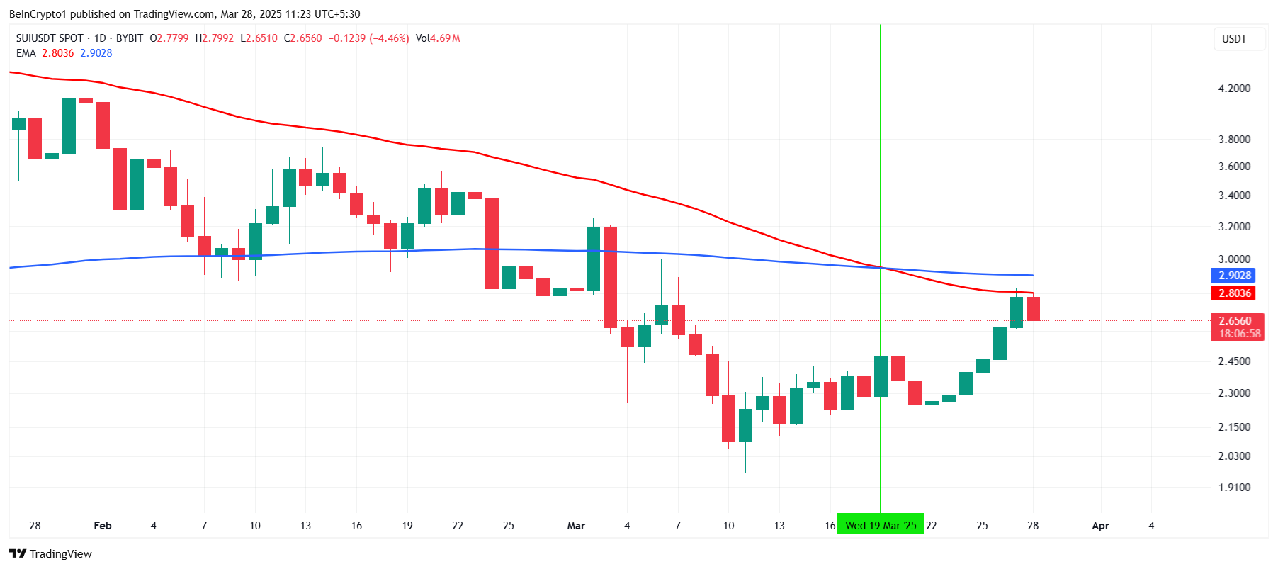 Mimo utworzenia krzyża śmierci dziewięć dni temu, makro-dynamika dla SUI pozostaje silna. Krzyż śmierci, gdzie 50-dniowa EMA przecina się poniżej 200-dniowej EMA, to zazwyczaj sygnał niedźwiedzi. Ten schemat często wskazujący na zmianę kierunku trendu na spadkowy.