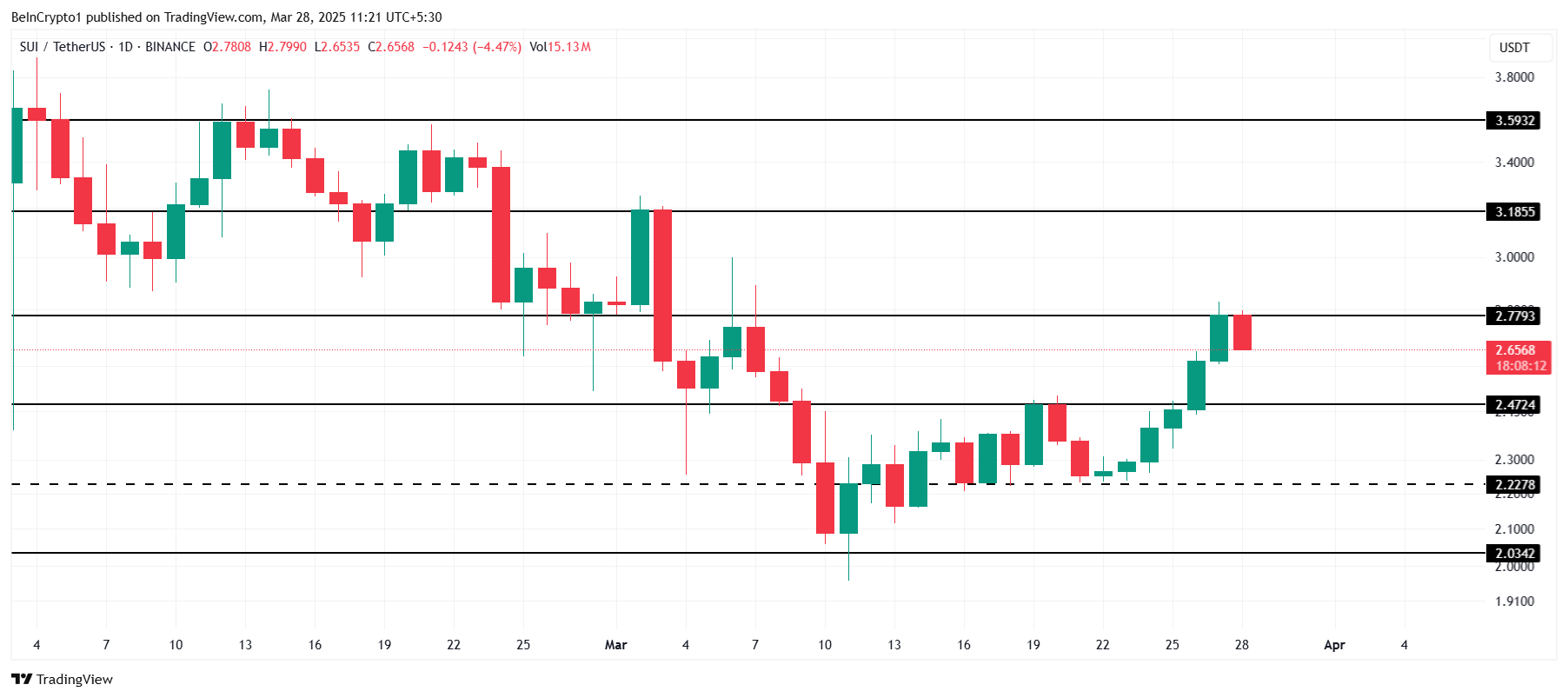 SUI obecnie handluje na poziomie 2,65 USD. Jest to wartość tuż poniżej kluczowego poziomu oporu na 2,77 USD. Przełamanie tej bariery może wywołać gwałtowny skok w kierunku poziomu na 3,00 USD. Jeśli altcoin z powodzeniem przebije poziom na 2,77 USD, prawdopodobnie będzie kontynuować wzrost w kierunku 3,00 USD. To jeszcze bardziej pobudzi bycze nastroje i potencjał dalszego wzrostu.
