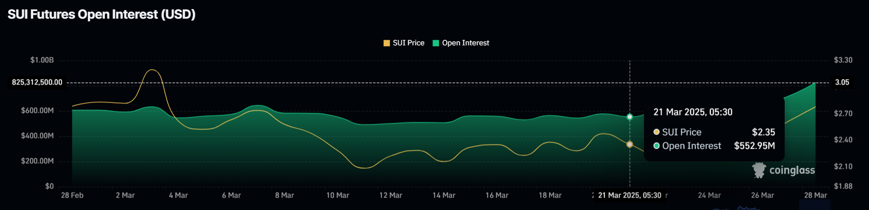 Otwarte pozycje dla SUI wzrósły o 273 mln USD w ciągu ostatniego tygodnia, zwiększając wartość o 50%. Obecna wartość otwartych pozycji wynosi teraz 825 mln USD, co sygnalizuje silne zaufanie. Ten wzrost tych wartości wskazuje, że więcej traderów aktywnie uczestniczy w rynku, a wielu jest optymistycznie nastawionych do przyszłych perspektyw altcoina.