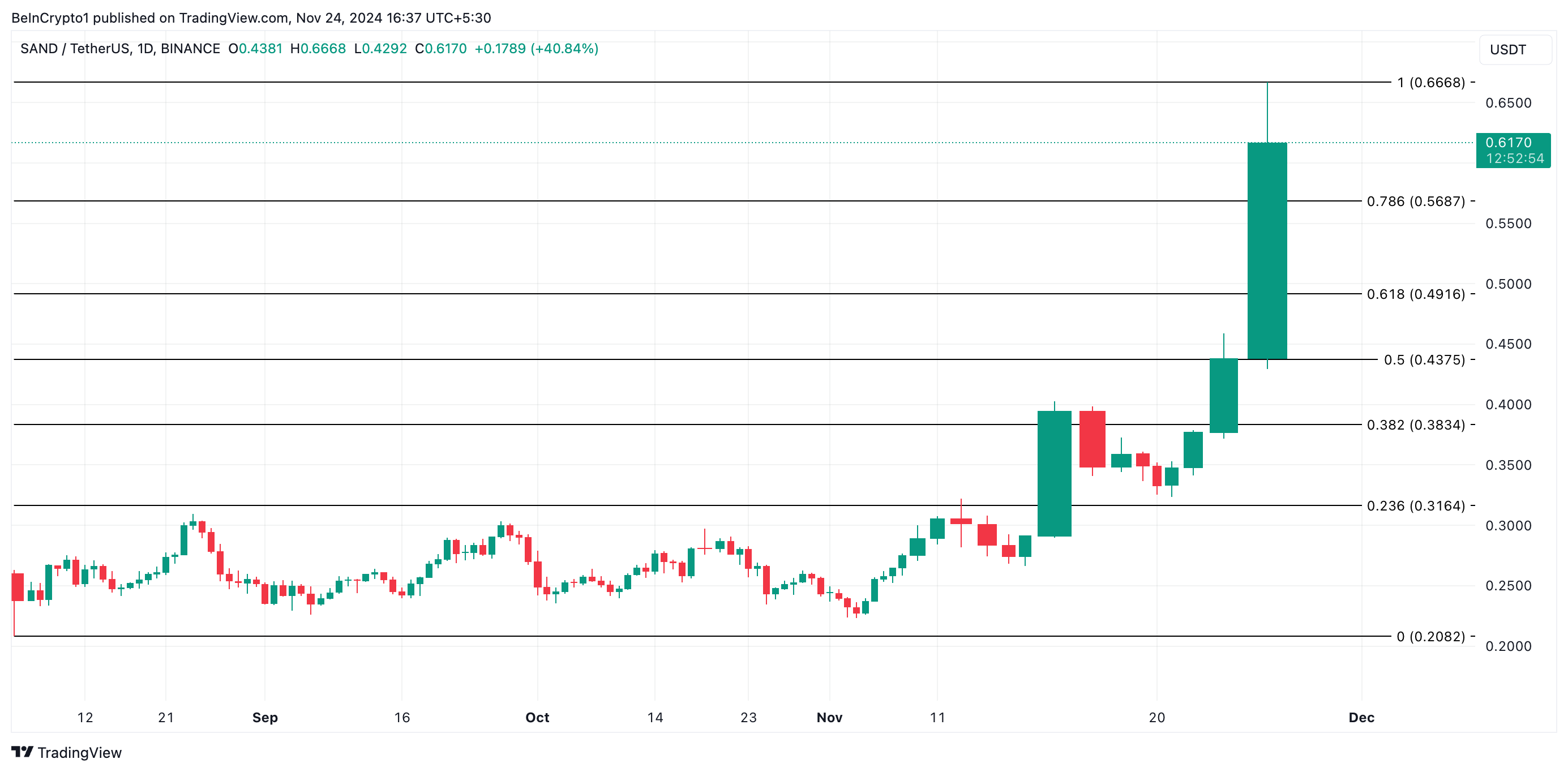 Na dziennym wykresie SAND rośnie o 55% i obecnie handluje się po 0,61 USD, poziomie ostatnio widzianym w kwietniu. Jego cena obecnie znajduje się poniżej oporu na szczycie cyklu wynoszącym 0,66 USD. Jeśli bycza dynamika się wzmocni, SAND może wzrosnąć w kierunku tego szczytu i go odzyskać.