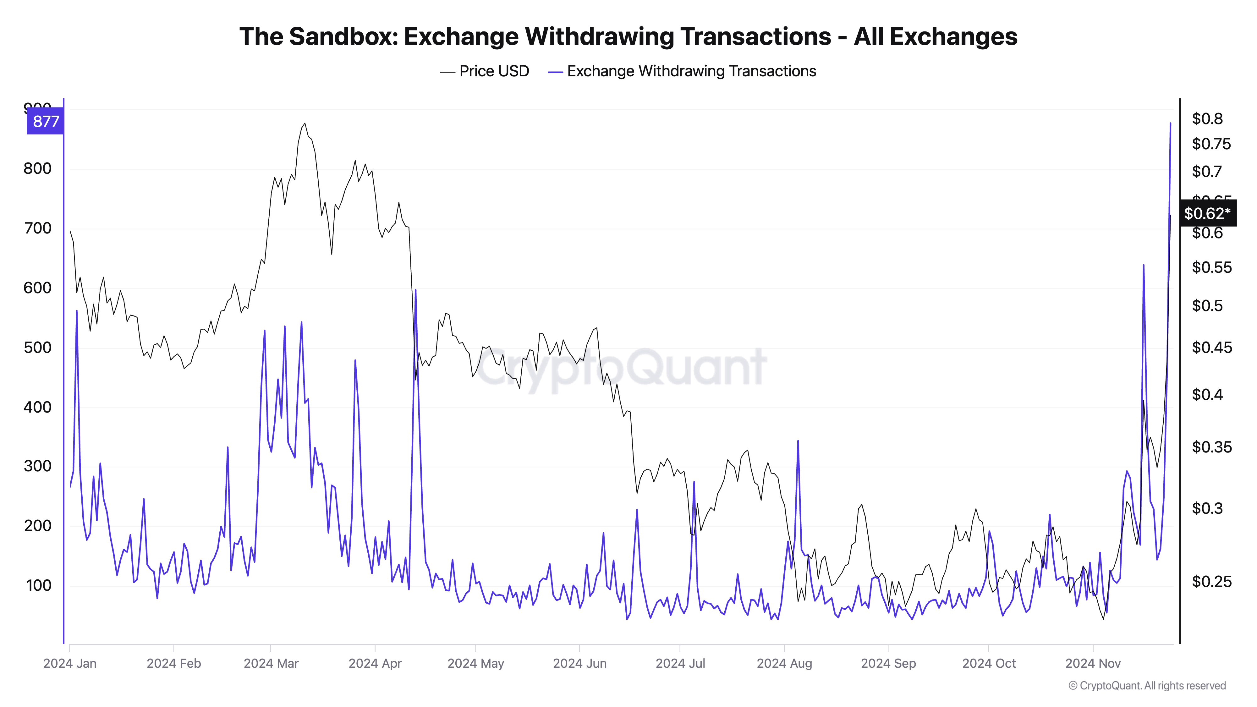 Dodatkowo zaobserwowano duży wzrost wypłat SAND z giełd. Według danych od CryptoQuant wypłaty tokena z giełd wynoszą obecnie 877 – jest to najwyższą wartością jednodniową od czerwca 2023 roku.