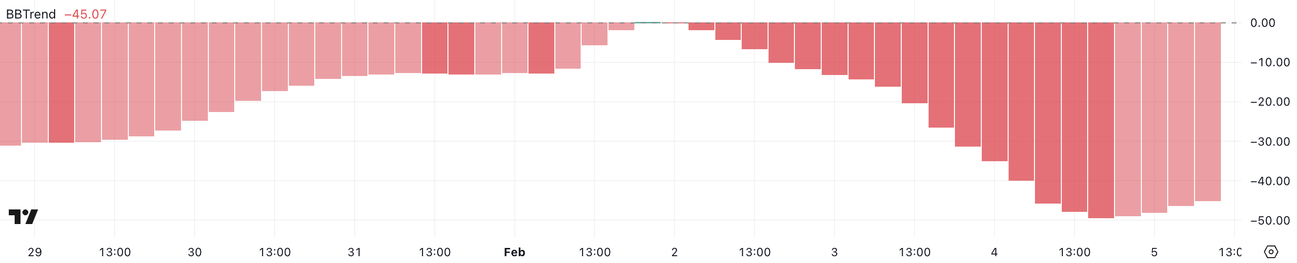 Wskaźnik BBTrend dla memecoina wynosi obecnie -45,07, co oznacza dziewiąty z rzędu dzień na negatywnym terytorium. Chociaż krótko stał się pozytywny 1 lutego, osiągając 0,16, szybko się odwrócił i kontynuował trend spadkowy.