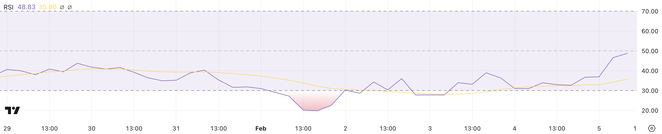 Wskaźnik poniżej 30 sugeruje, że aktywo jest wyprzedane i może być gotowe do odbicia, co jest zgodne z ostatnią akcją cenową. Teraz przy 48,5 RSI jest na najwyższym poziomie od tygodni, pokazując, że momentum przesuwa się w kierunku bardziej neutralnego stanowiska, chociaż nie weszło jeszcze na terytorium byków.
