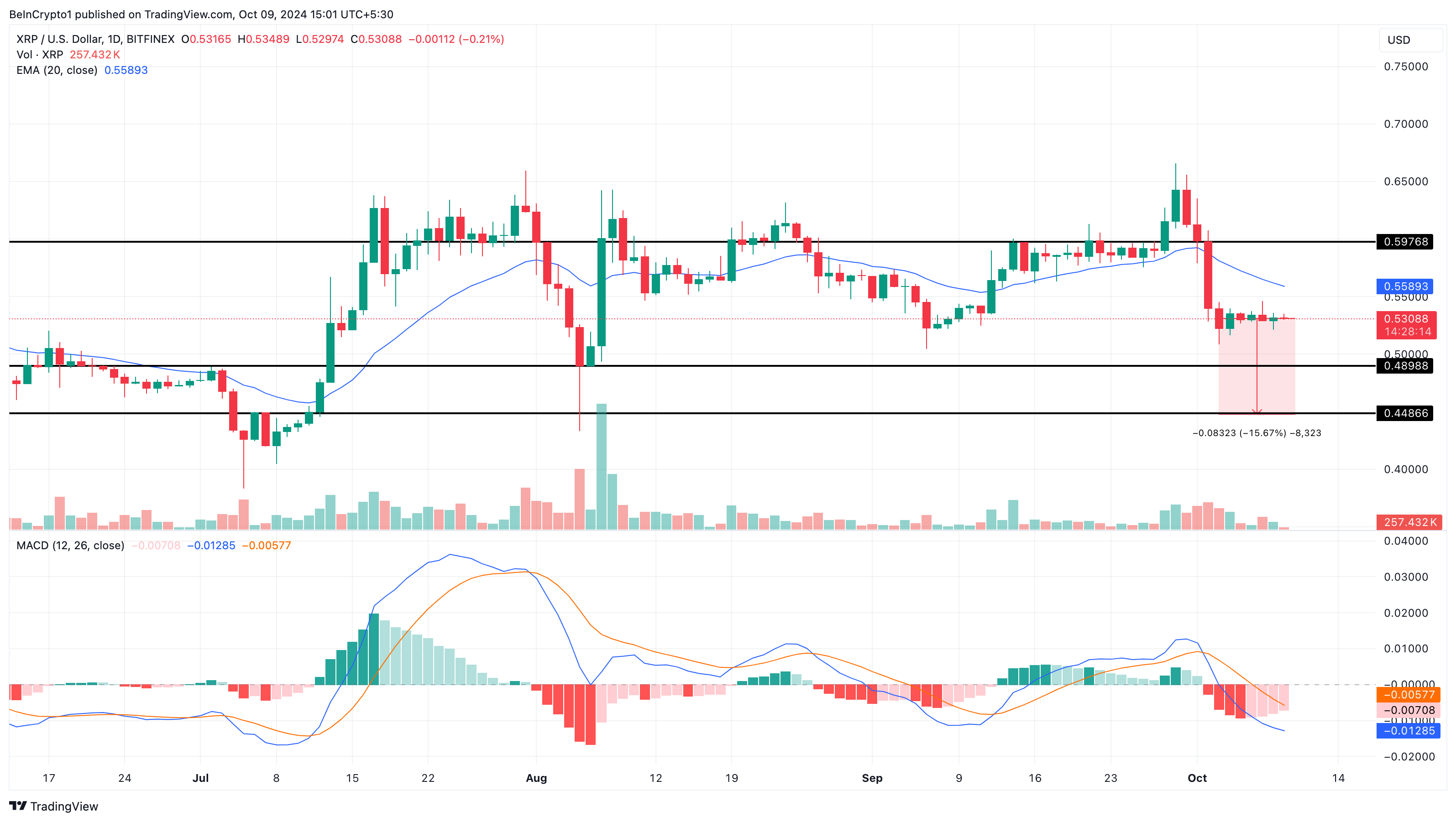 Gdy cena jest powyżej tego wskaźnika, trend jest byczy. Ale ponieważ XRP jest poniżej niego, wartość tokena może nadal spadać. Ponadto, wskaźnik MACD jest negatywny.