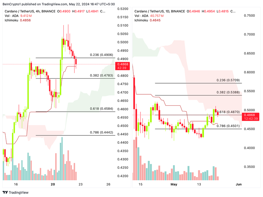 Jeśli ADA wybije się do dziennej chmury Ichimoku, celując w przedział od 0,5388 USD do 0,5709 USD, może to popchnąć cenę do wyższych poziomów w średnim terminie.