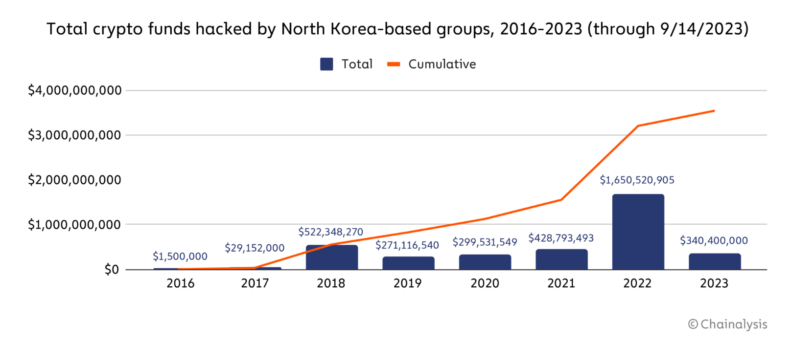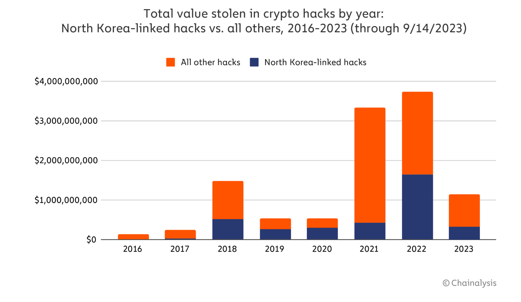 Chainalysis szacuje, że północnokoreańskie grupy ukradły łącznie 3,54 miliarda dolarów w różnych kryptowalutach od 2016 roku.Taki trend z pewnością można przypisać ogólnemu spadkowi aktywności w branży aktywów cyfrowych.