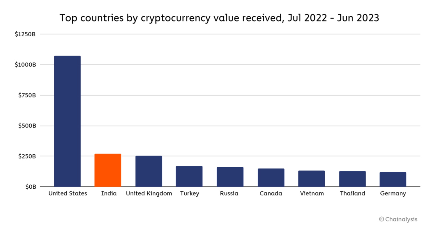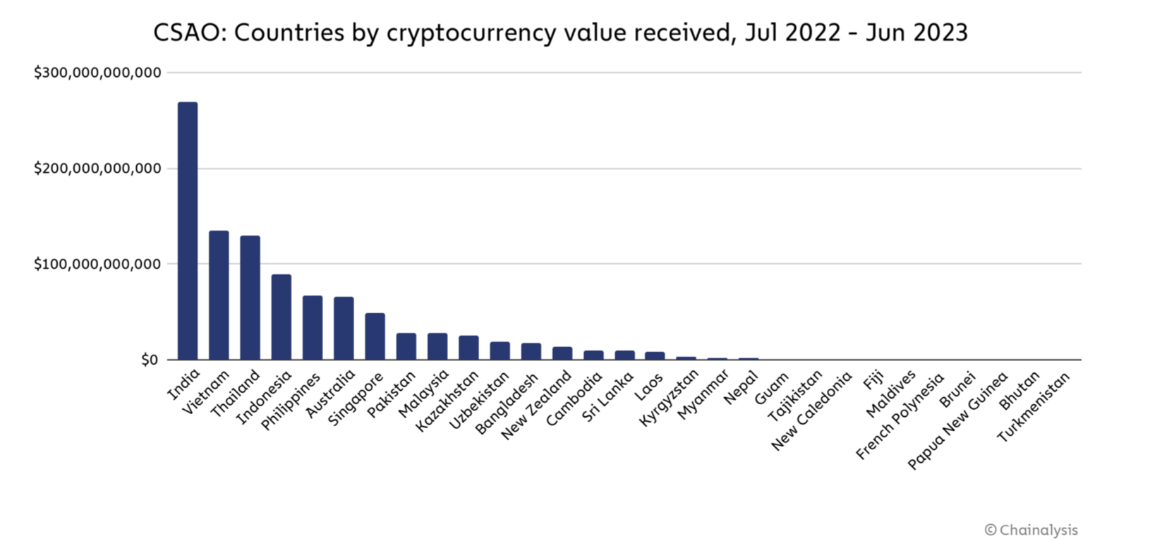 Tymczasem Indie są liderem w regionie pod względem przekazów pieniężnych. Wolumen w okresie od lipca 2022 r. do czerwca 2023 r. wyniósł tam 268,9 mld USD. Jest to dość zaskakujące, ponieważ analitycy zwrócili uwagę na nieprzyjazne dla kryptowalut przepisy podatkowe w tym kraju.