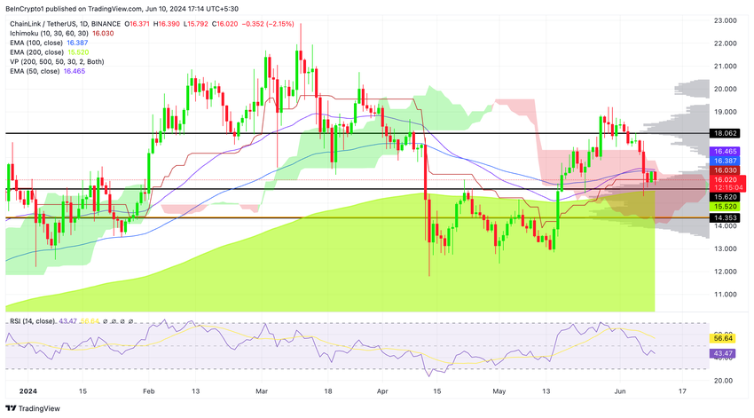 Na dziennym wykresie Chainlink wszedł w chmurę Ichimoku. Jest to bardzo niedźwiedzi sygnał. W tym czasie RSI również znacznie spadł z 70 do 43.
