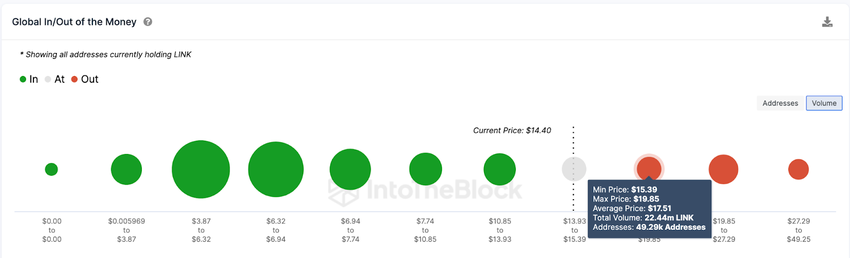 Jednak pokazują, że cena Chainlink musi najpierw pokonać początkowy opór na poziomie 15,40 USD, aby byki mogły być pewne odzyskania 20 USD. Jak pokazano poniżej, 49 290 posiadaczy kupiło 22,42 mln LINK po minimalnej cenie 15,40 USD Jeśli ci posiadacze sprzedadzą wcześniej, mogą spowolnić wzrost cen.