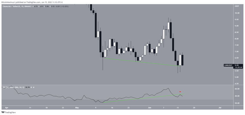 Chainlink spada od czasu rekordu wszech czasów (ATH) na poziomie 53 USD w maju 2021 roku. Ruch w dół doprowadził w tym miesiącu do dołka na poziomie 5,30 USD. Oznacza to spadek o 89% w stosunku do ATH.