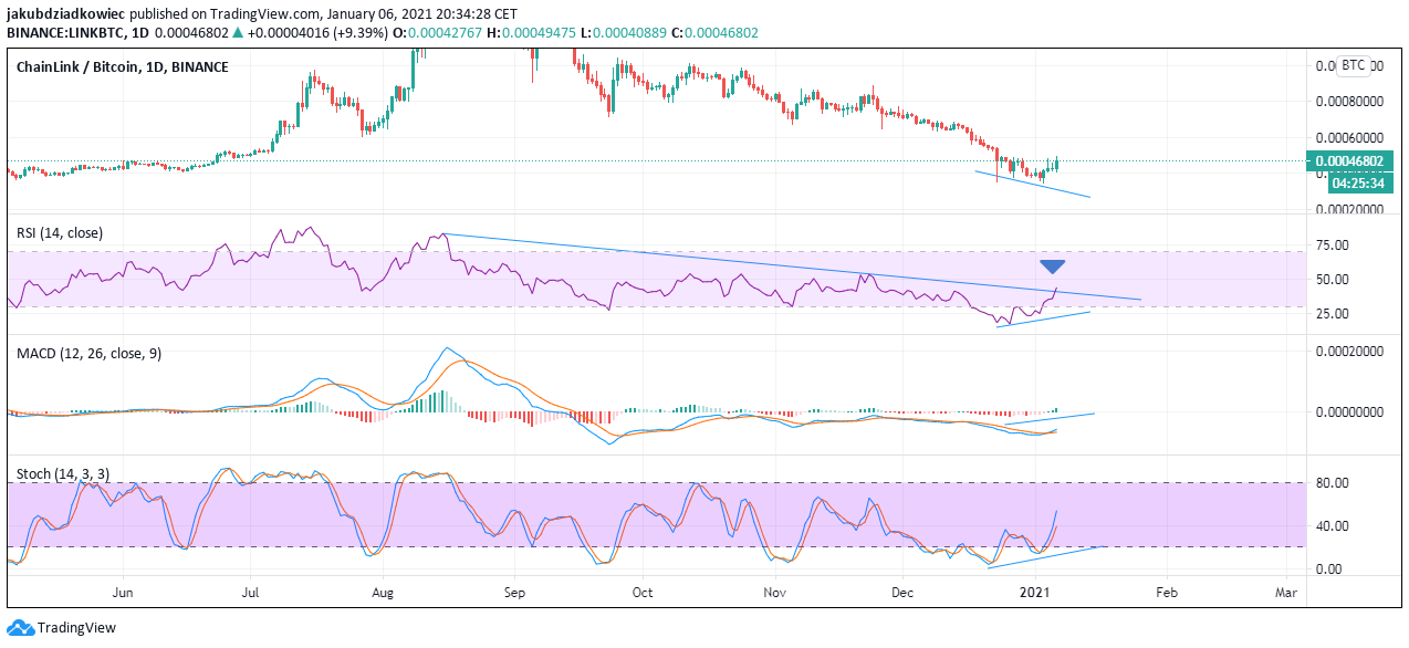 Sponsored Sponsored- RSI przebija się przez neutralne terytorium i wkracza powyżej 50. Podobnie jak w parze LINK/USD oscylator wybił się właśnie z długoterminowej opadającej linii (niebieski znacznik).