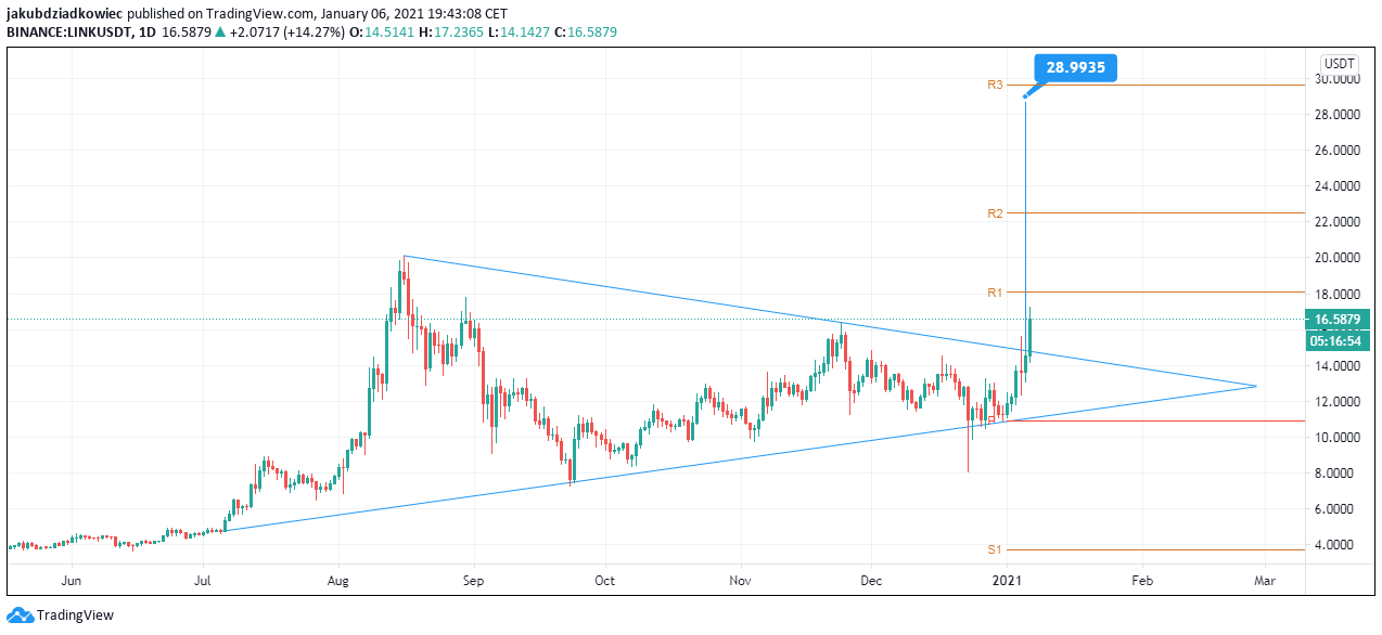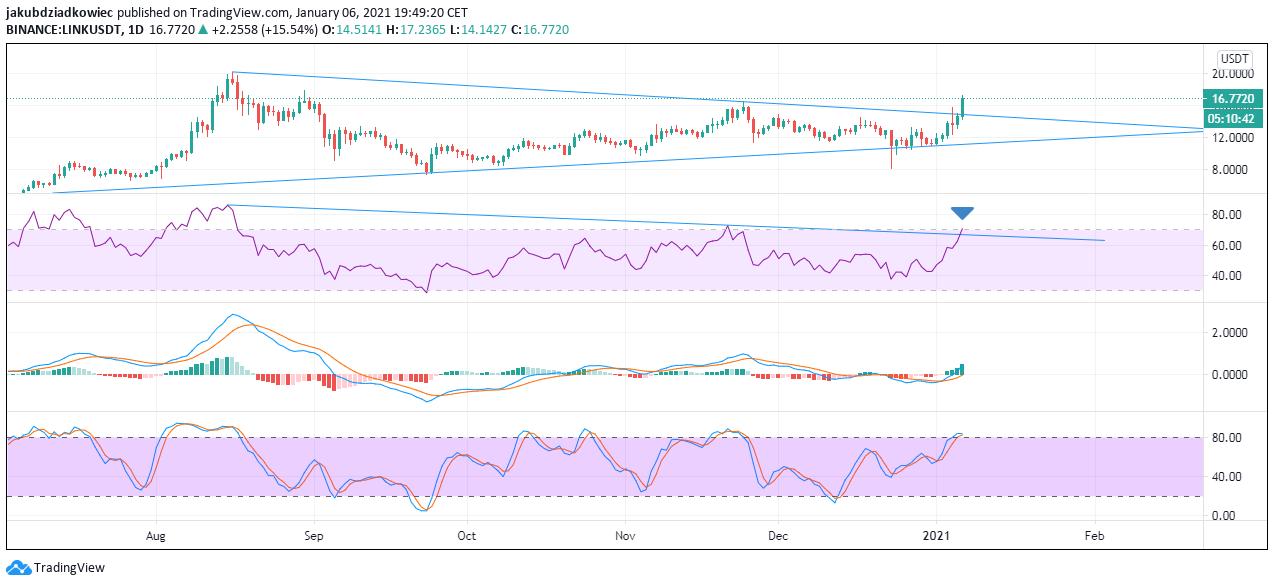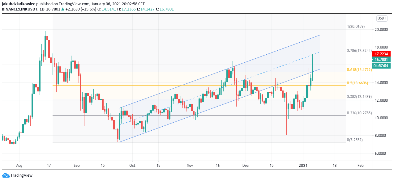 Od początku 2021 roku cena Chainlink wzrosła o ponad 50%. Tylko w dniu wczorajszym kryptowaluta wzrosła o około 20% i osiągnęła poziom 17 USD.