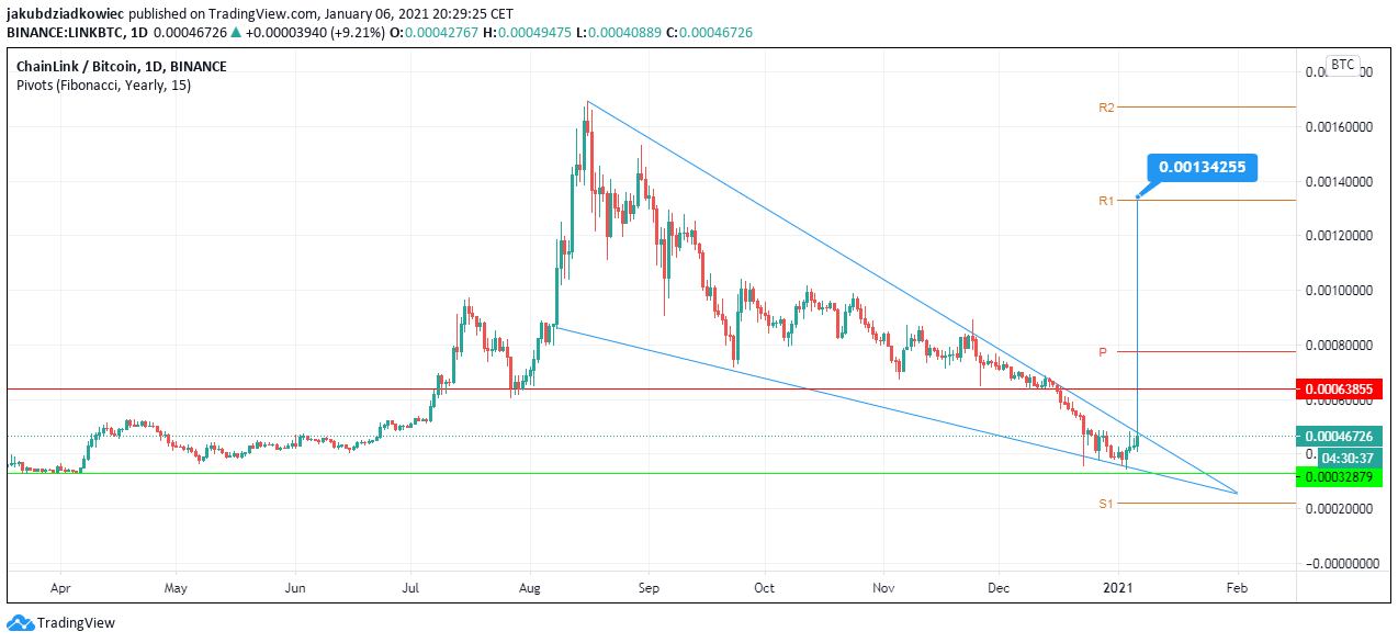 Jeżeli spojrzeć na podobieństwa z akcją cenową Ethereum (ETH), to w niedalekiej przyszłości możliwe są ekspotencjalne wzrosty. Również LINK w parze do BTC ma szanse wybić się z długoterminowego wzorca opadającego klina.