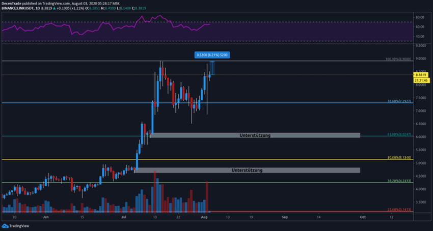 Jak dotąd wykresy godzinowe nie pokazują już żadnych rozpoznawalnych sygnałów odwrócenia. Akcja cenowa pokazuje, jak LINK natychmiast odzyskał poziom cen na 8 USDT jako wsparcie po tymczasowym spadku do 6,87 USDT.
