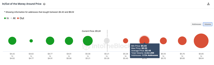 SponsoredJednak dane In/Out of The Money Around Price (IOMAP) od IntoTheBlock sugerują, że LINK napotka początkowy opór w okolicach poziomu 5,50 USD.