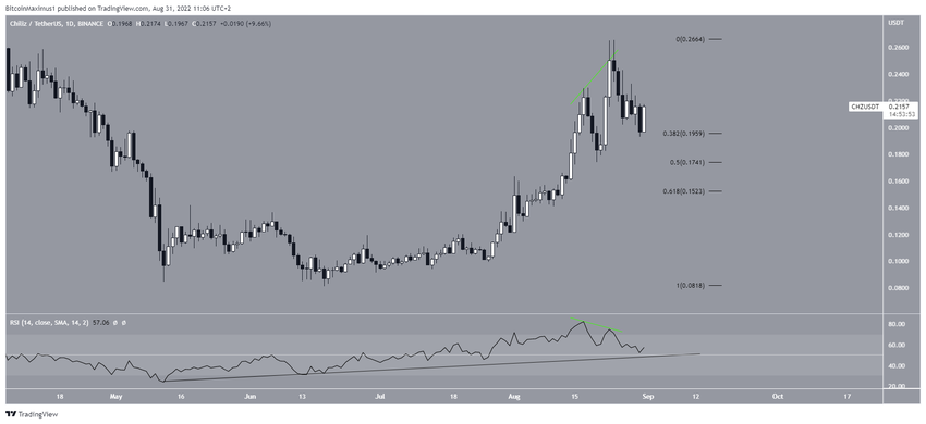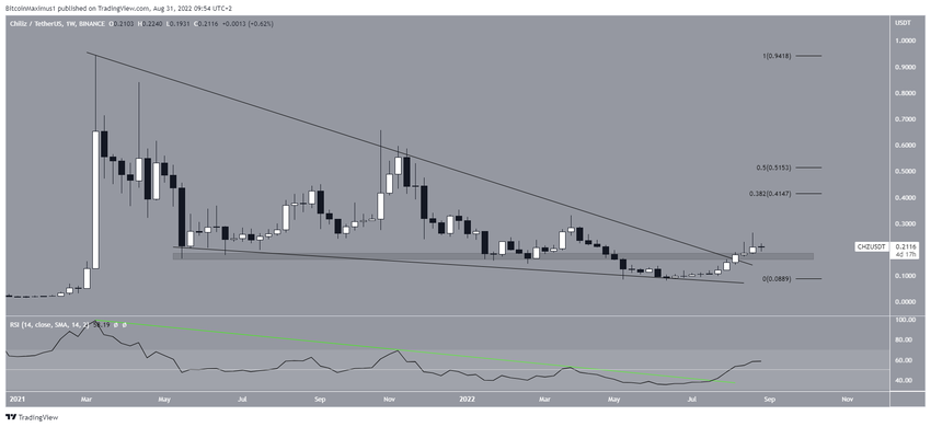 Od tego czasu cena wzrasta i udało się jej wybić z klina na początku sierpnia. W tym samym czasie Chiliz odzyskał również obszar oporu na 0,178 USD. Obszar ten wcześniej zapewniał wsparcie od maja 2021 roku, zanim cena ostatecznie się załamała. Teraz oczekuje się, że obszar ten ponownie zapewni wsparcie.