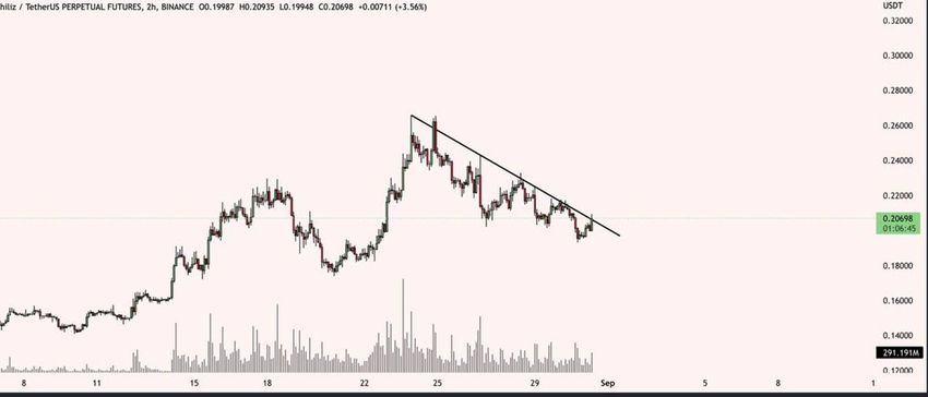 Trader @BscGemHungers opublikował na Twitterze wykres Chiliz. Stwierdził, że jeśli cena wybije się z opadającej linii oporu, może wzrosnąć w kierunku 0,22-0,245 USD.