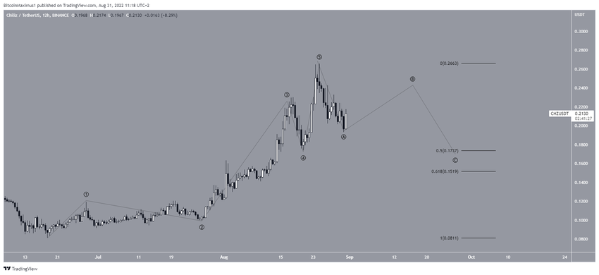 Wykres dzienny pokazuje, że CHZ rozpoczął pięciofalowy ruch w górę w dniu 18 czerwca. Szczyt z 24 sierpnia na poziomie 0,265 USD był prawdopodobnie końcem tego pięciofalowego ruchu.