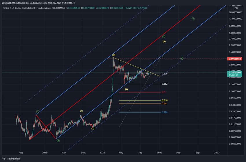 Trader kryptowalutowy @TheTradinghubb nakreślił liczbę fal CHZ, w której Chiliz rozpoczyna długoterminową falę piątą. Ma ona zaprowadzić CHZ do nowego ATH.